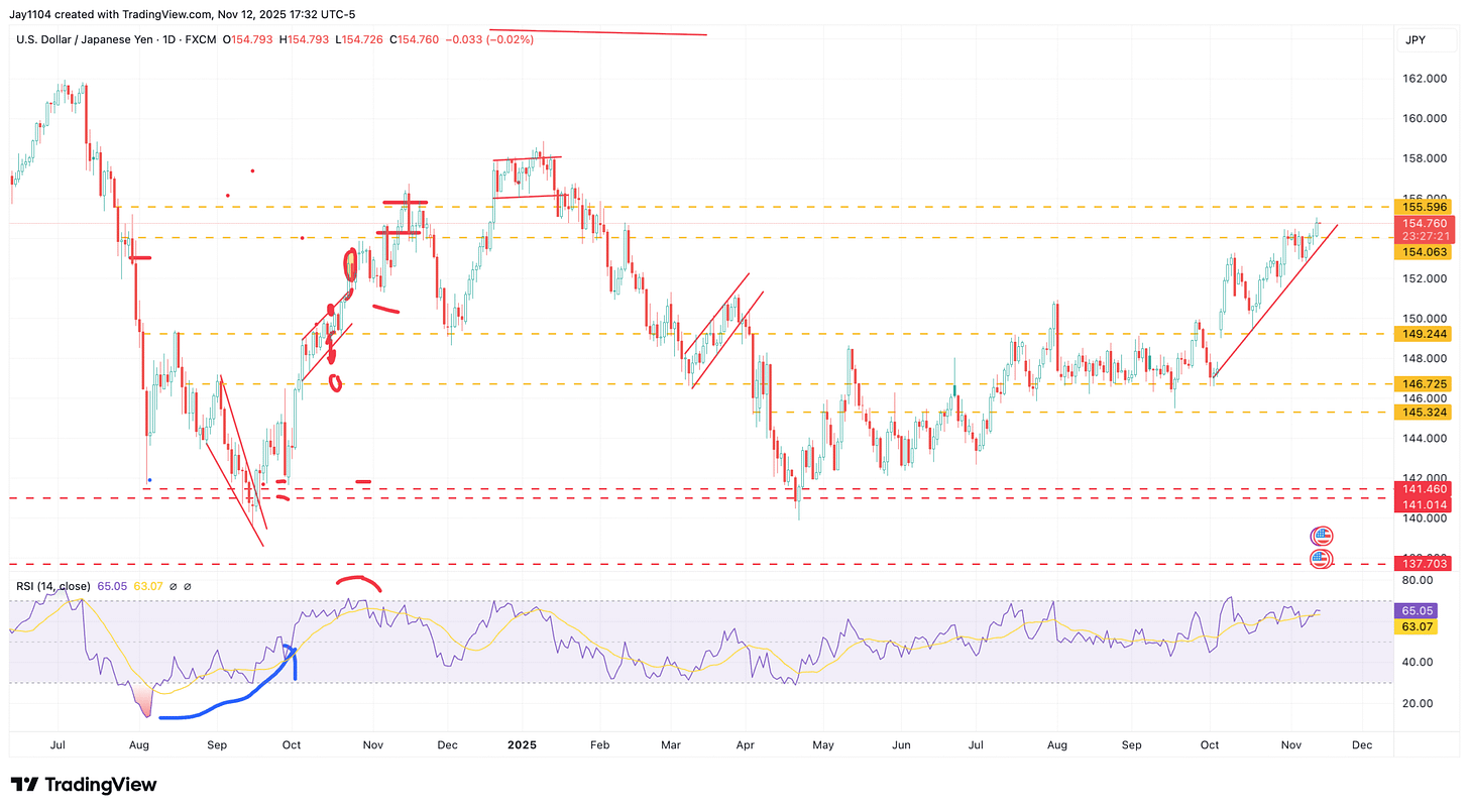 The USD/JPY rose sharply today, pushing the yen through resistance at 154. It could now be on its way to 156, and potentially even higher.