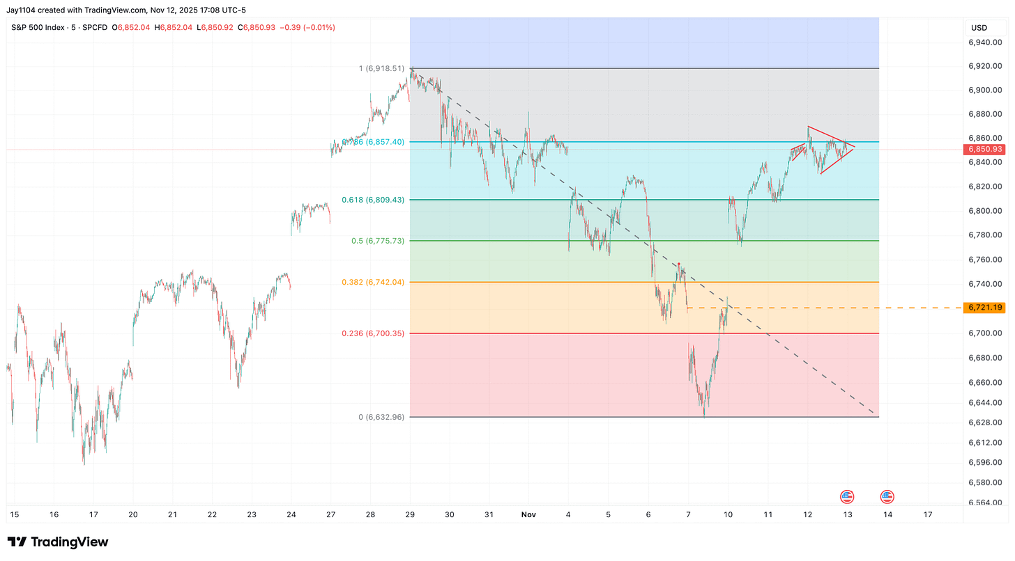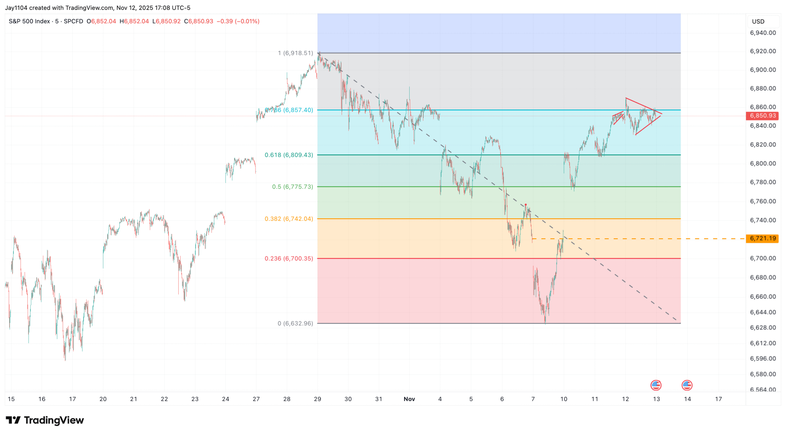 For now, the S&P 500 has stalled at the 78.6% retracement level, near 6,850. It will be interesting to see whether the recent pattern continues and the index moves lower, potentially refilling the gap down at 6,720 before the week is over.