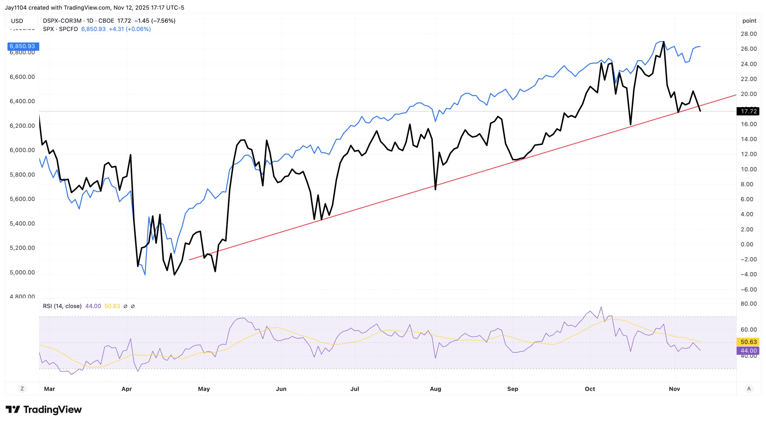 In the meantime, we saw implied correlations rise today and the S&P 500 dispersion index decline. This caused the spread between the dispersion index and the three-month implied correlations index to narrow and potentially break below an uptrend that began in mid-April. This could be an important development because, historically, the S&P 500 tends to move in the same direction as this spread. At the moment, the two are diverging slightly, suggesting that if a real move lower is emerging in the relationship between dispersion and correlations, the S&P 500 should follow this spread lower.