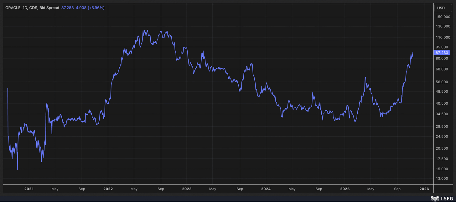 Additionally, we saw high-yield credit spreads move higher today, along with investment-grade spreads. Most notably, Oracle’s five-year credit default swap widened to 87.1 on the bid side, up from 82.4 previously. This now marks the highest level for Oracle’s CDS spread since early 2023.