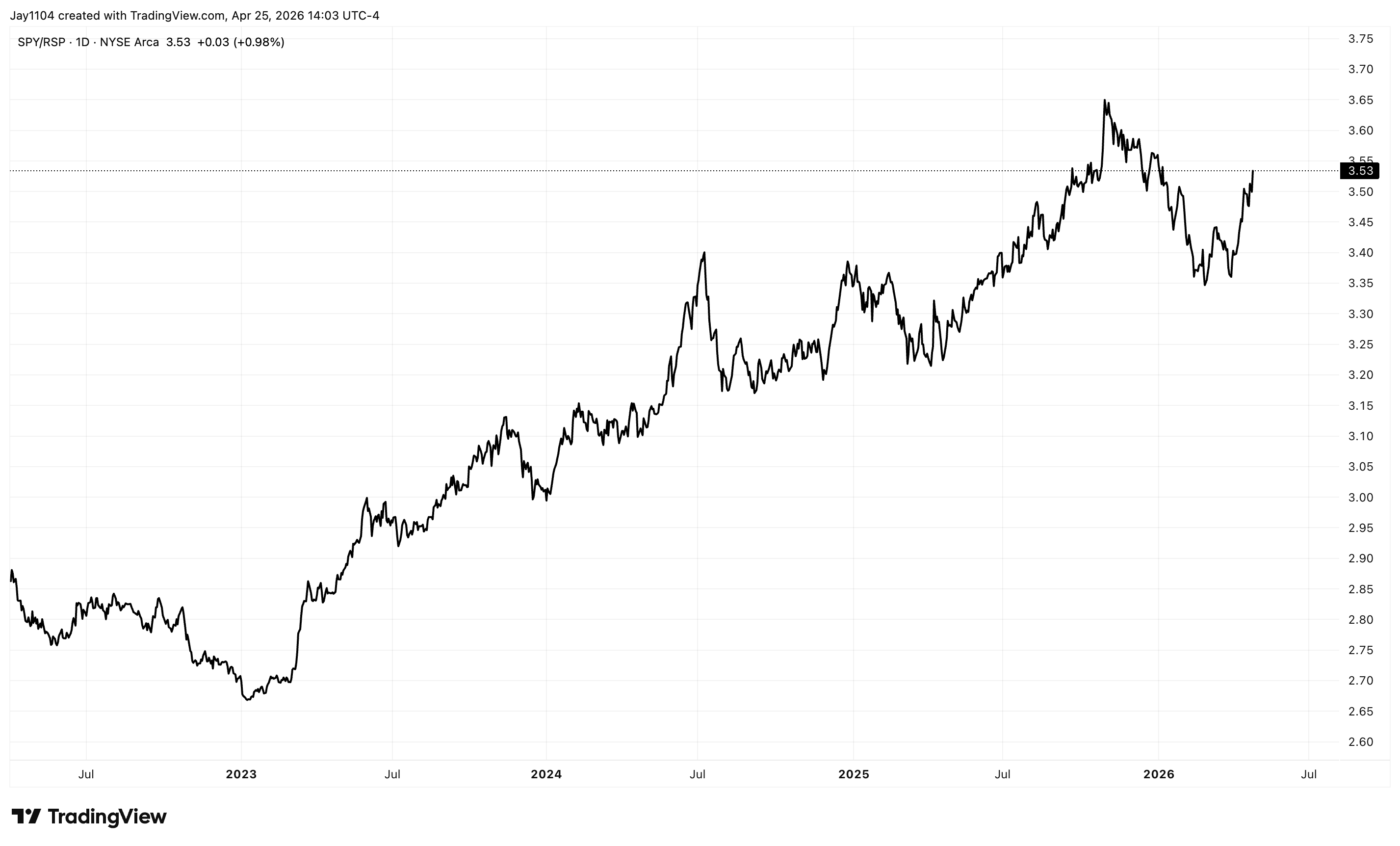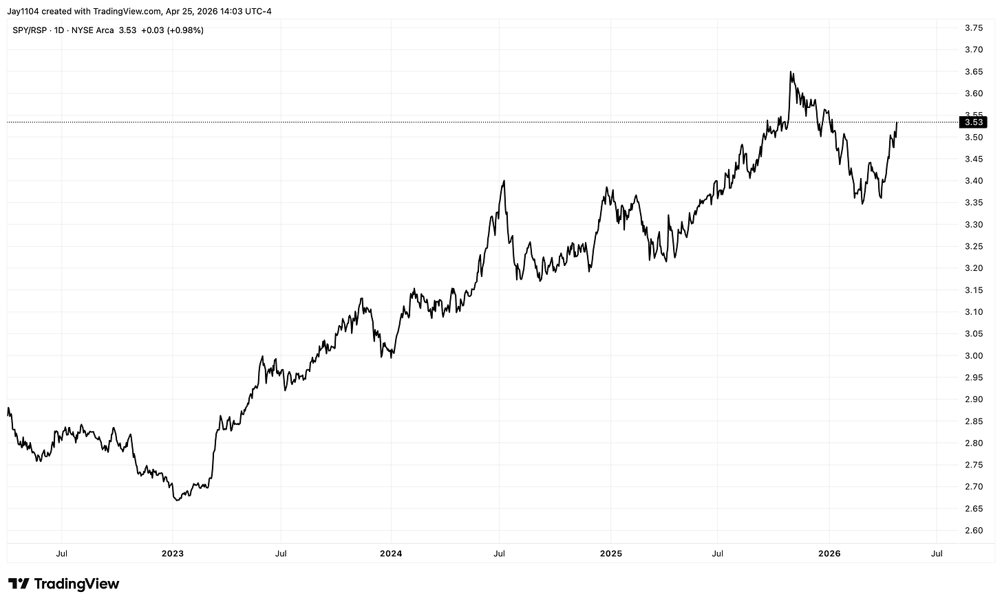 You can get a really good sense of this just by looking at the SPY divided by the RSP. The SPY is the market-cap-weighted ETF, and the RSP is the equal-weight ETF, meaning every stock in the RSP has the same input — NVIDIA is just as important as, let’s say, Macy’s. Whereas in the S&P 500 market cap, NVIDIA is a giant and nothing really compares.
