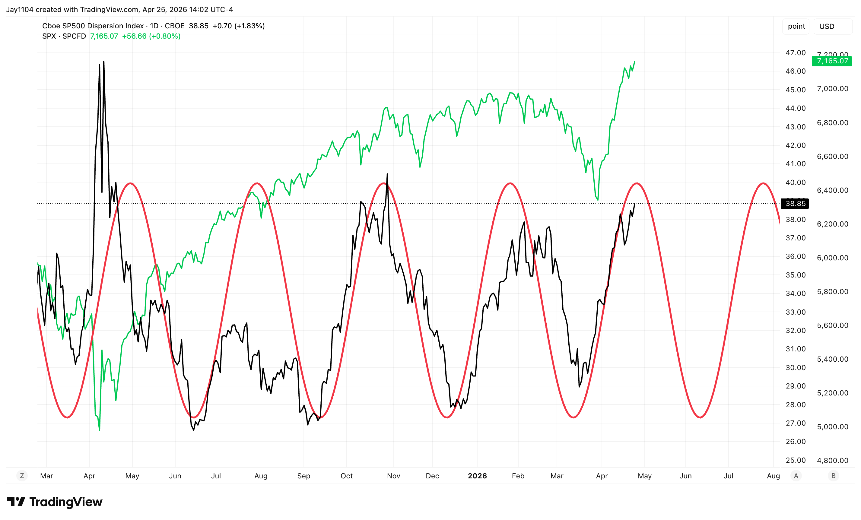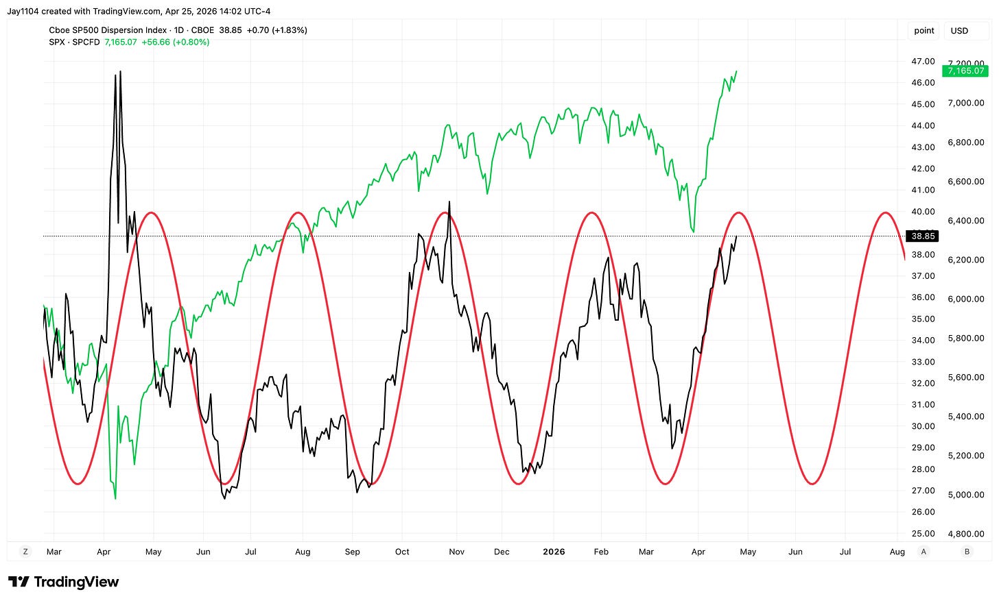 You can see this exact pattern earlier in the year. In the middle of February — basically right after NVIDIA reported — the dispersion index came all the way down, and the S&P 500 came down with it. The dispersion index started turning back up in mid-March, really took off on the 23rd, and the S&P was actually still going lower at that point. Then it started coming down more sharply.