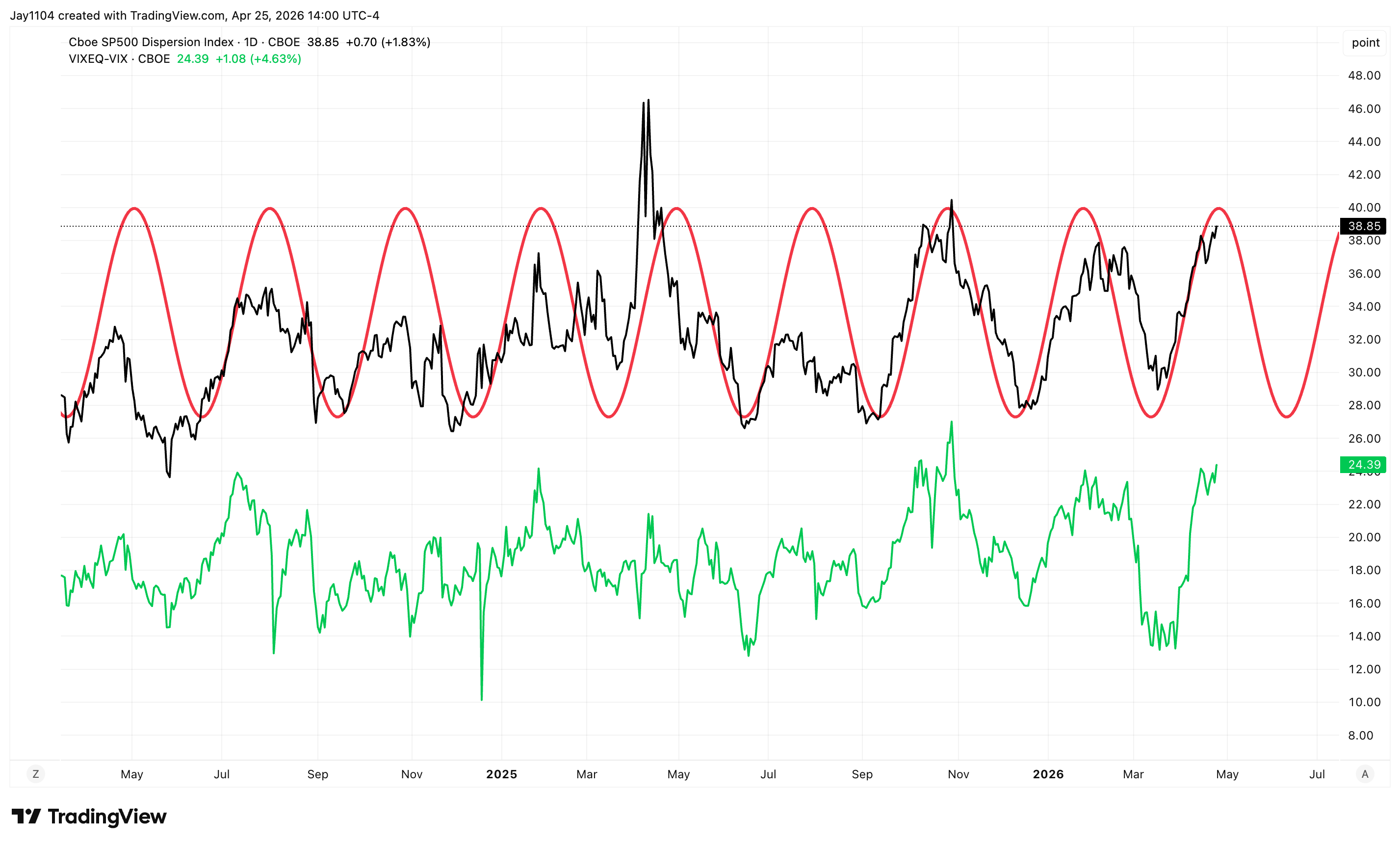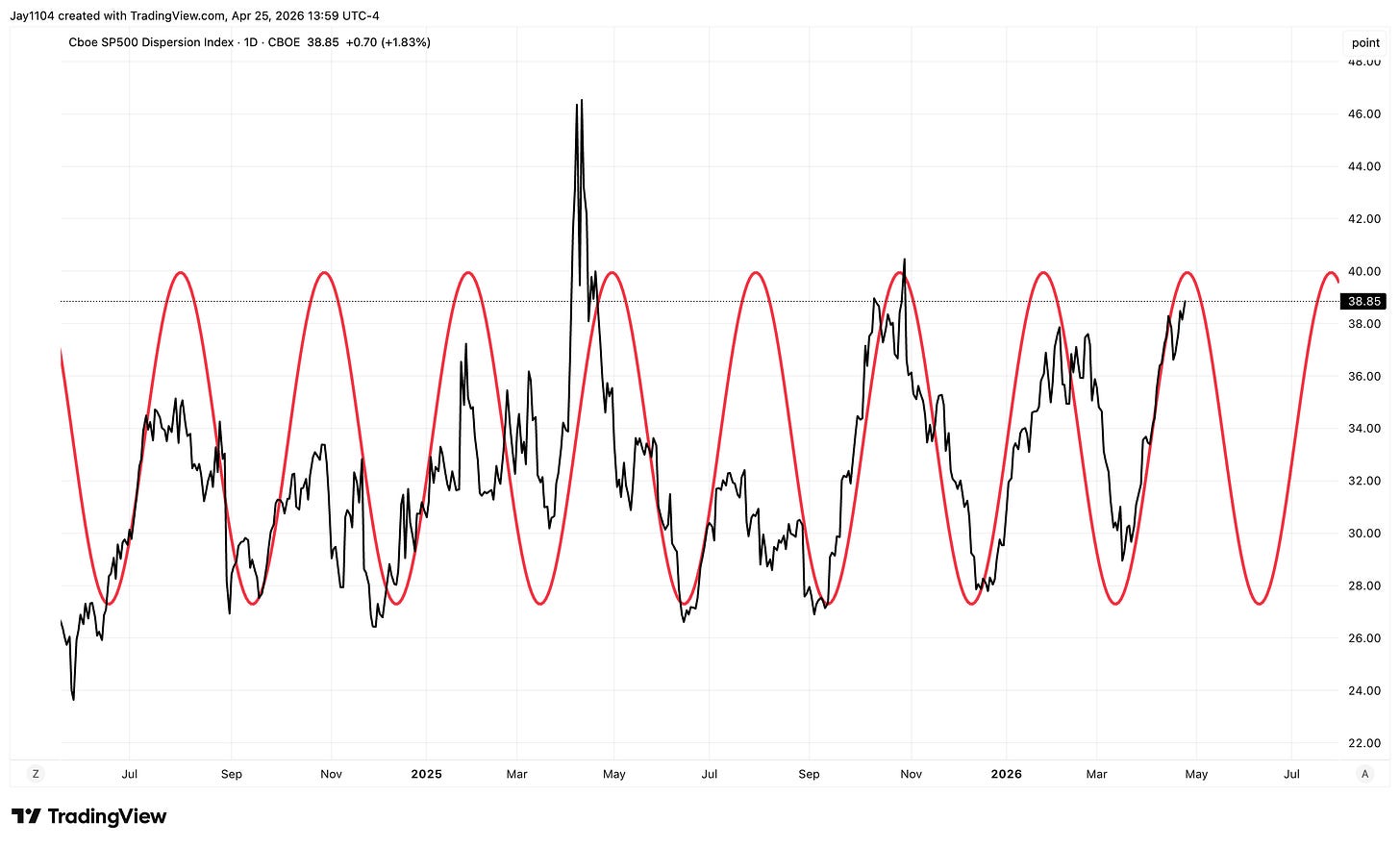 There’s actually an index that monitors dispersion — it’s called the S&P 500 Dispersion Index. When dispersion is high, you tend to see the dispersion index rising. Right now, the dispersion index is quite high. It’s telling us that the dispersion trade essentially is quite crowded.