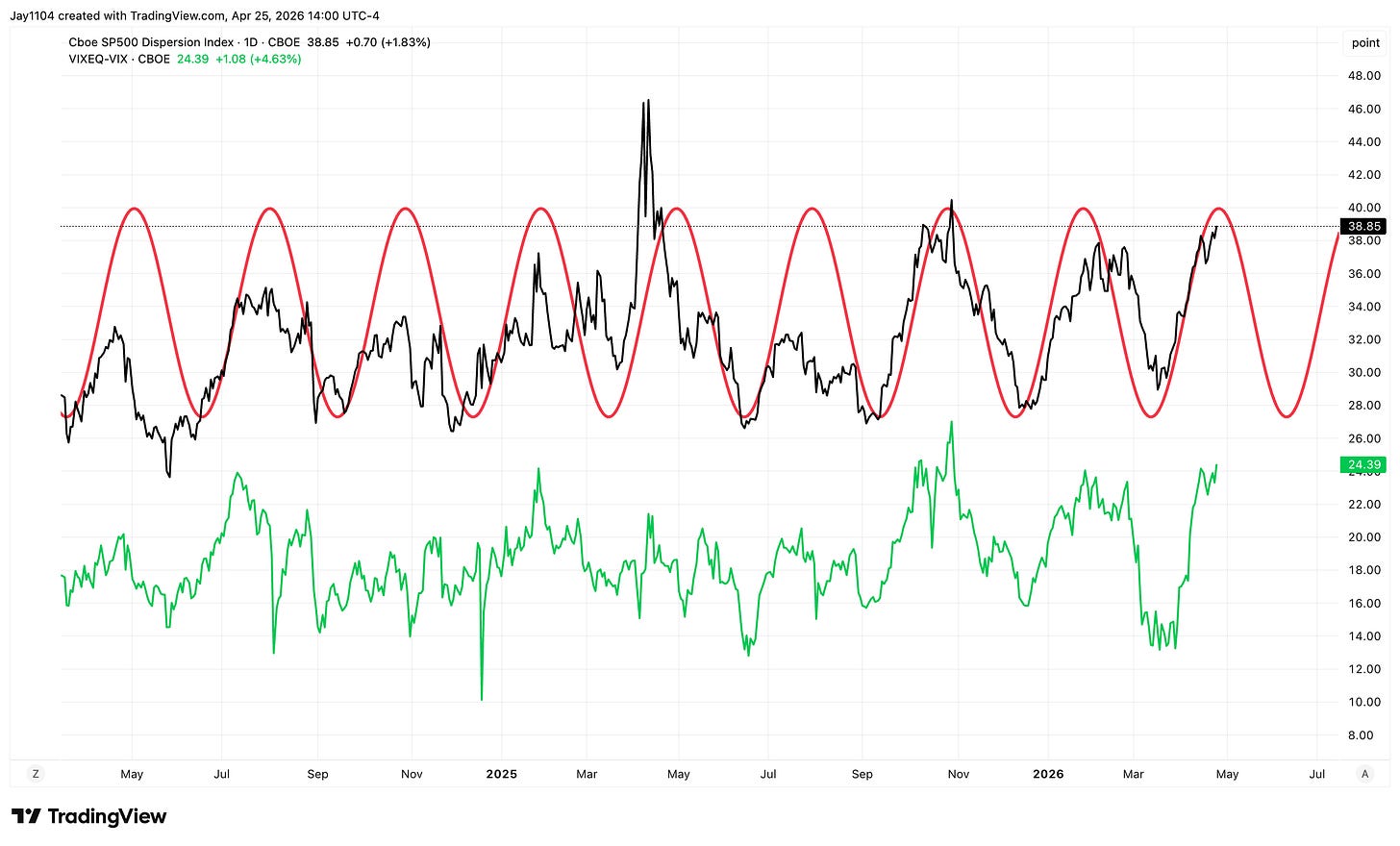 Seasonal/cyclical pattern named — The dispersion trade has run on essentially the same cadence across July 2025, September 2025, October 2025, January 2026, and now March / April 2026. Mike calls it close to “a sine graph” — earnings windows generally push it up, post-megacap earnings generally start to bring it down.