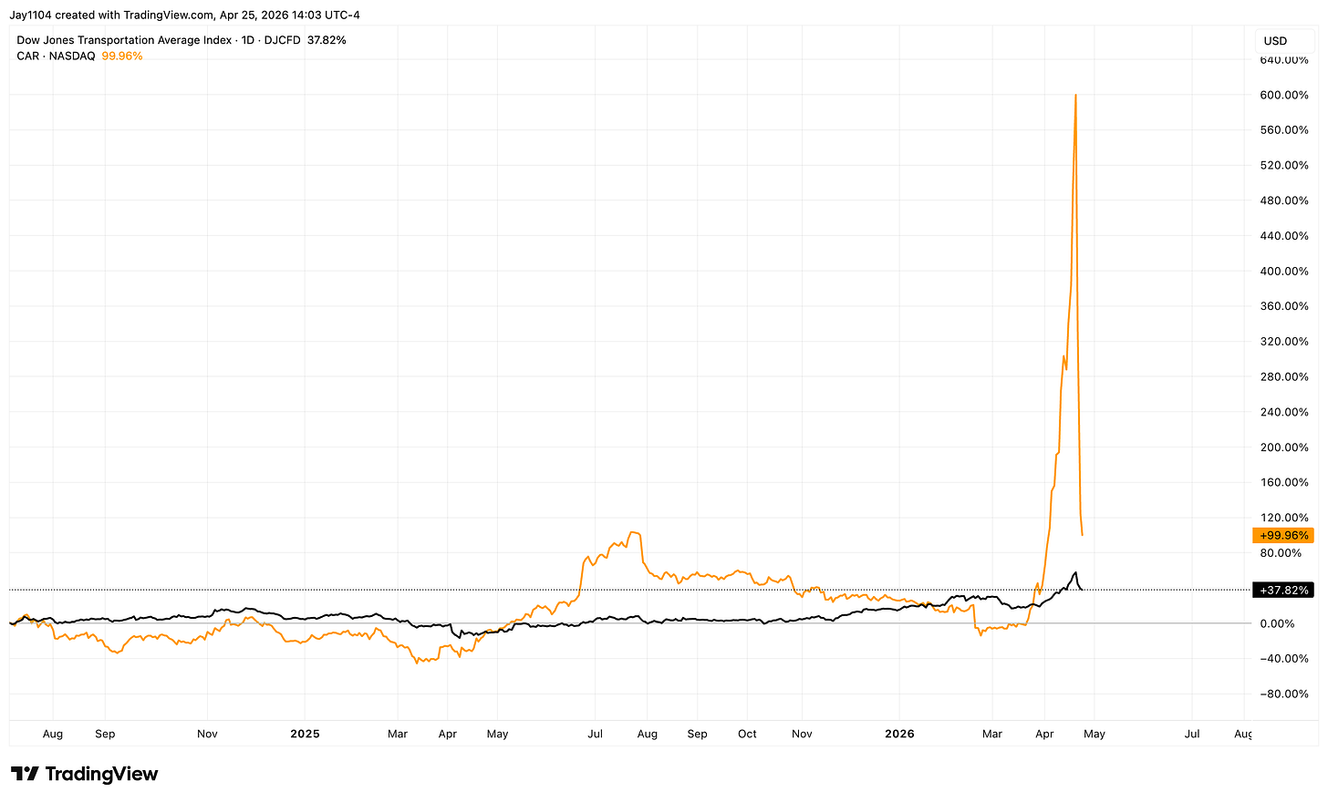 If you’ve noticed, the S&P obviously has gone on to make a new high, and the Nasdaq has gone on to make a new high. But if you also notice, the Dow has not, and the RSP has not. The Dow Transports have gone on to make a new high, but there’s all sorts of crazy things going on there with Avis. Avis being in the Dow Transports has really skewed that average, and it’s not the first time that’s happened — so I would not even pay attention to that. You can also see small caps have gone to a new high.