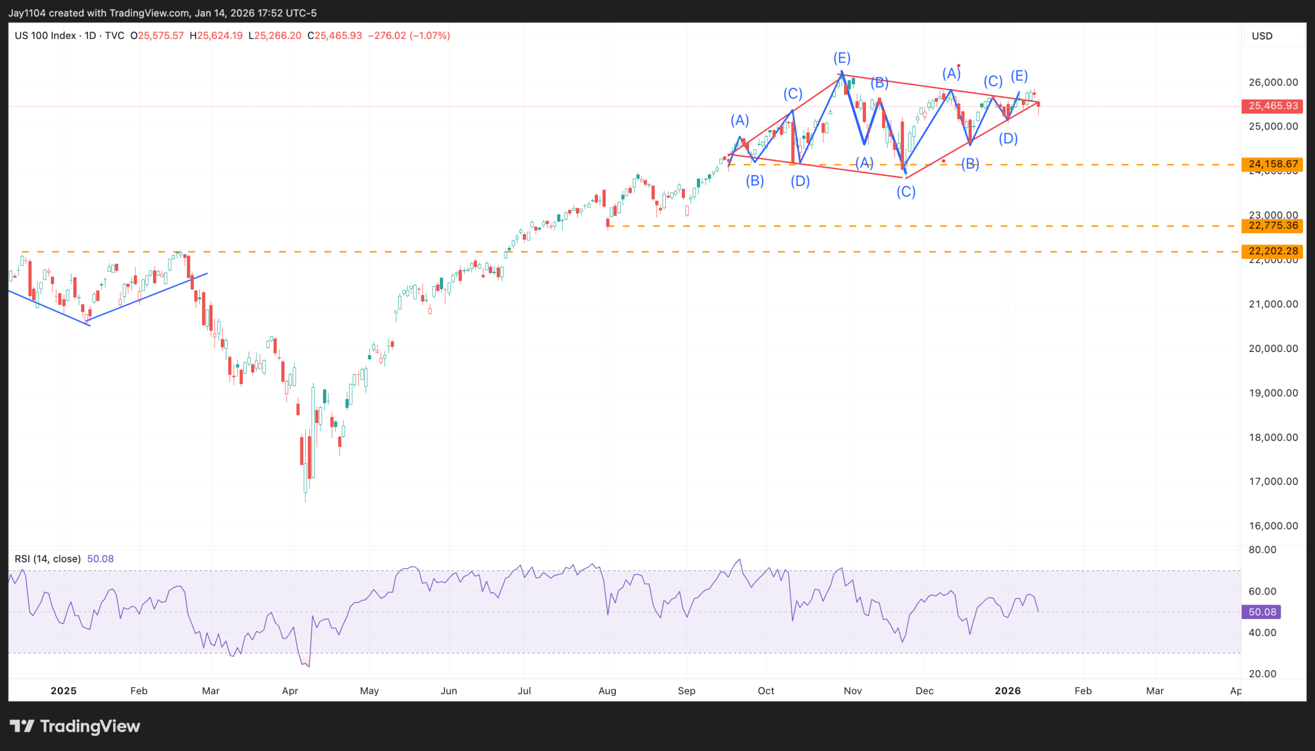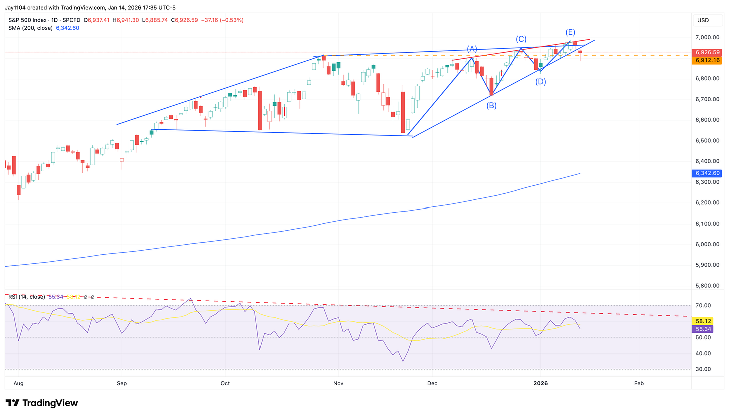 Based on the pattern, it appears that the S&P 500 could initially return to 6,550; what happens thereafter remains to be seen. I will note that the S&P 500 has had numerous opportunities to break out and move higher, but has been unable to do so. The index is essentially unchanged since the end of October, whether one likes it or not.