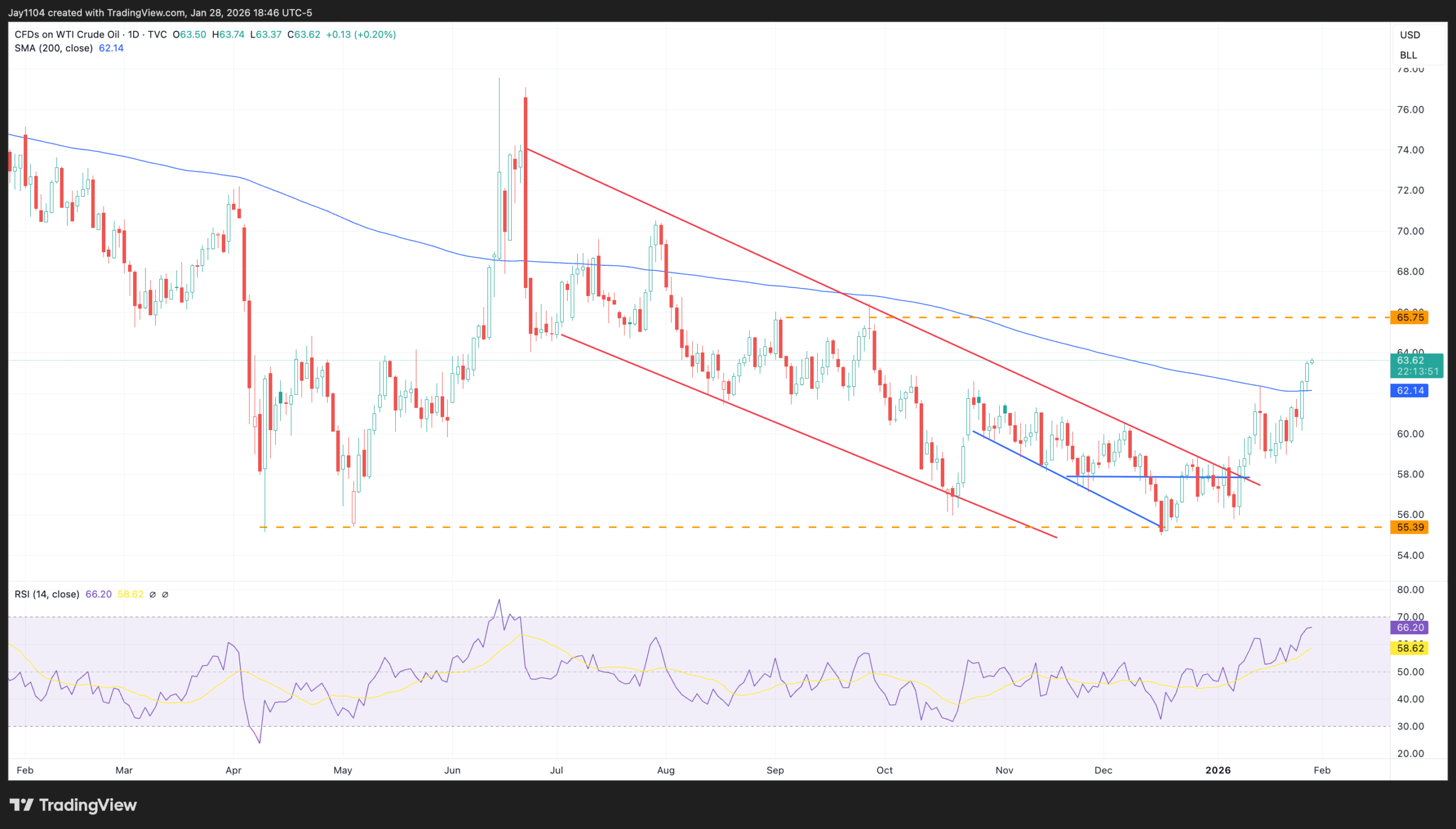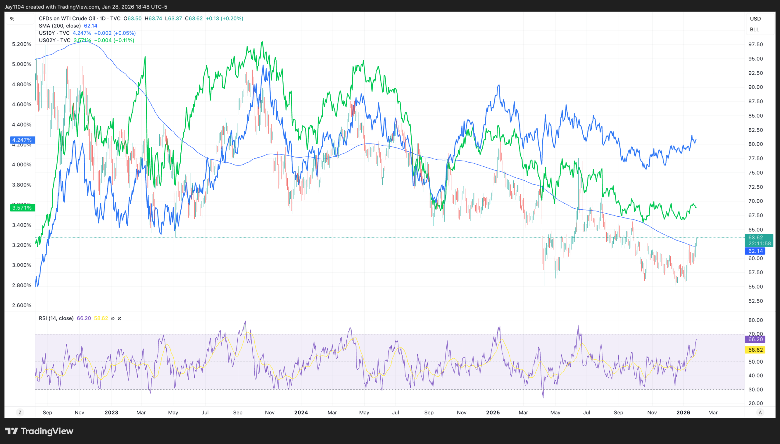 In the meantime, it would seem that where rates go in the near term will have much more to do with oil than anything else. Oil did break out and moved past its 200-day moving average. I think that, over the near term, this sets up a potential rally to $65.