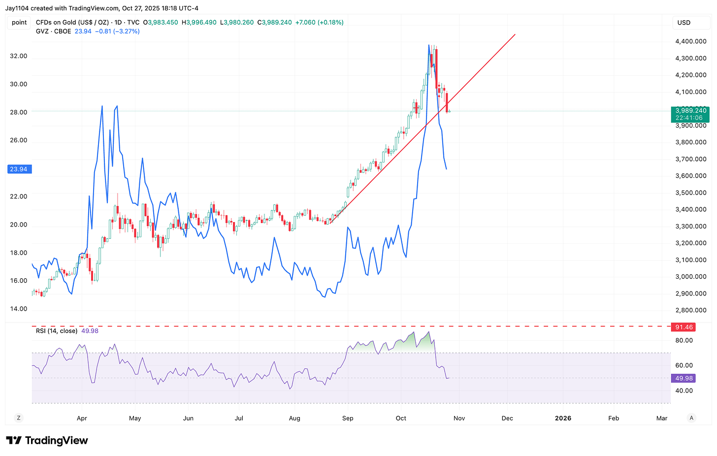 Speaking of volatility, gold volatility continues to decline—and so does gold’s price. This really just reinforces how speculative the move in gold was in many ways.