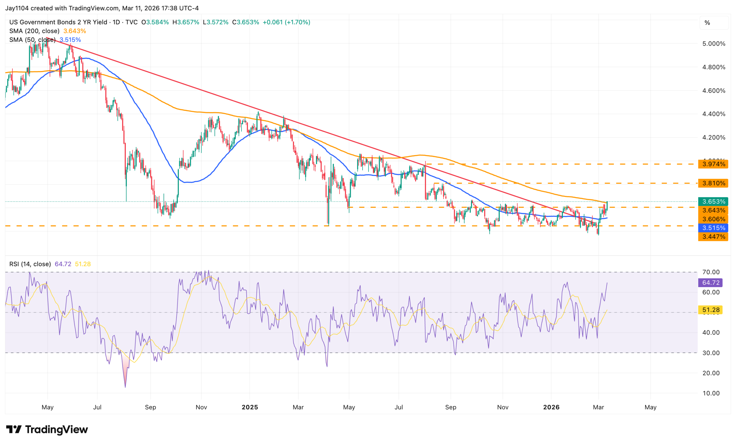 The 2-year climbed above resistance at 3.65% and closed just above the 200-day moving average. A move back to 3.8% on the 2-year at least, based on the technical chart, seems like a real possibility.