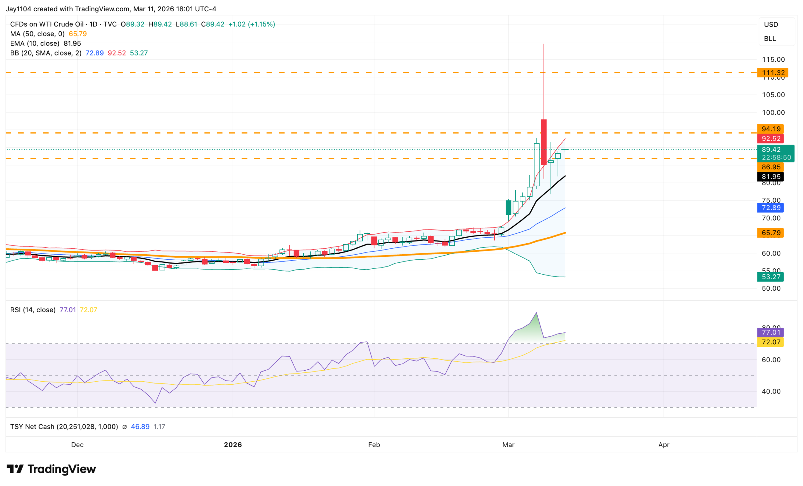 Meanwhile, oil continues to trend higher overall, with the 10-day exponential moving average acting as support and the upper Bollinger band as resistance. So for now, as long as oil stays above the 10-day, the higher trend will remain intact.