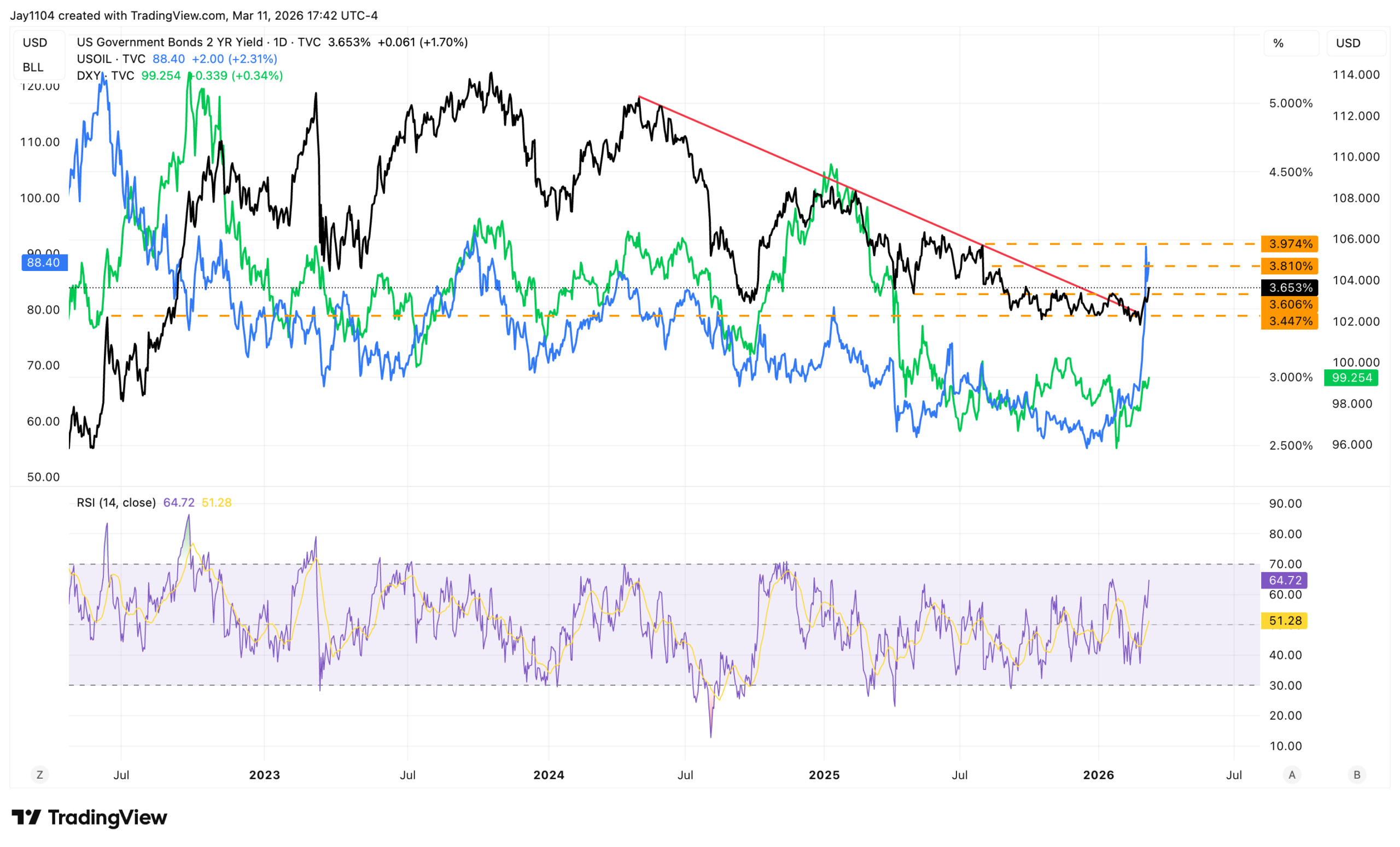 The connection between rates, oil, and even the dollar has been very strong in recent years, so if oil is going to be trading up to these higher levels, the more likely it is that rates will rise and the dollar will strengthen.