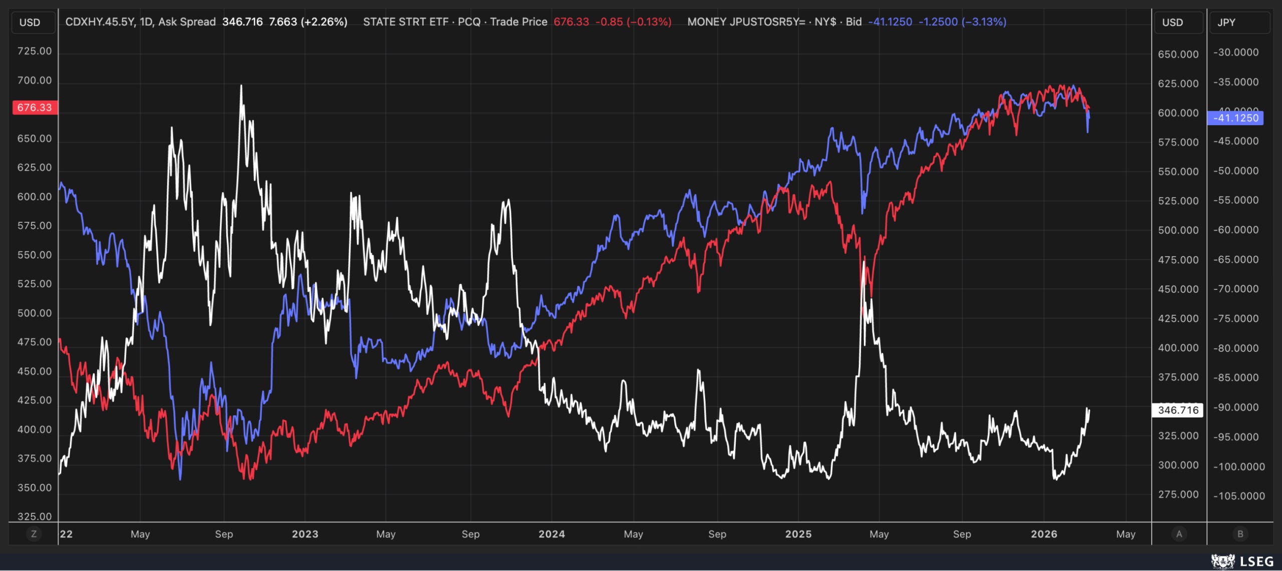 This is having many effects in the market that are not visible in the S&P 500. First off, HY credit spreads continue to widen, and second, cross-currency basis swaps have turned more negative, which tells a few things. Demand for dollar hedging is growing, liquidity flows have diminished, and financial conditions are tightening.