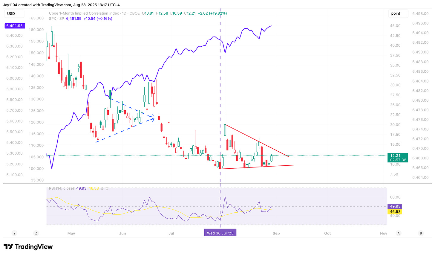The S&P 500 is up just 10 bps on the day, and more importantly, we are seeing one-month implied correlations rise for a second consecutive day. Typically, rising implied correlations are associated with a falling S&P 500, not a rising one. With Nvidia now behind us, implied volatility for equities has essentially reset, creating an opportunity for correlations to rise again.