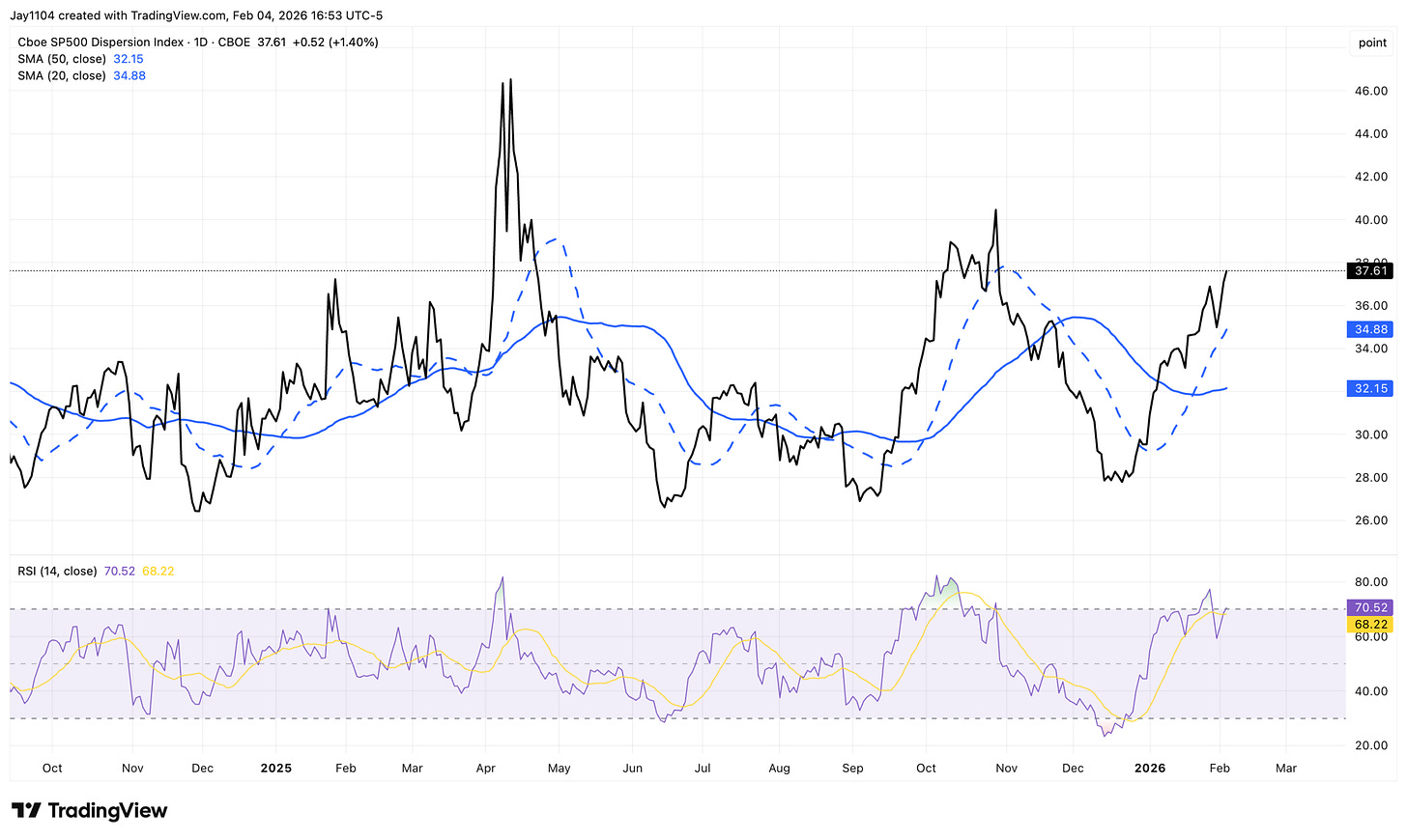The dispersion index, minus the 3-month implied correlation index spread, has risen today. Again, this spread should be positioned to contract over the next couple of weeks as earnings season winds down and these dispersion trades unwind.