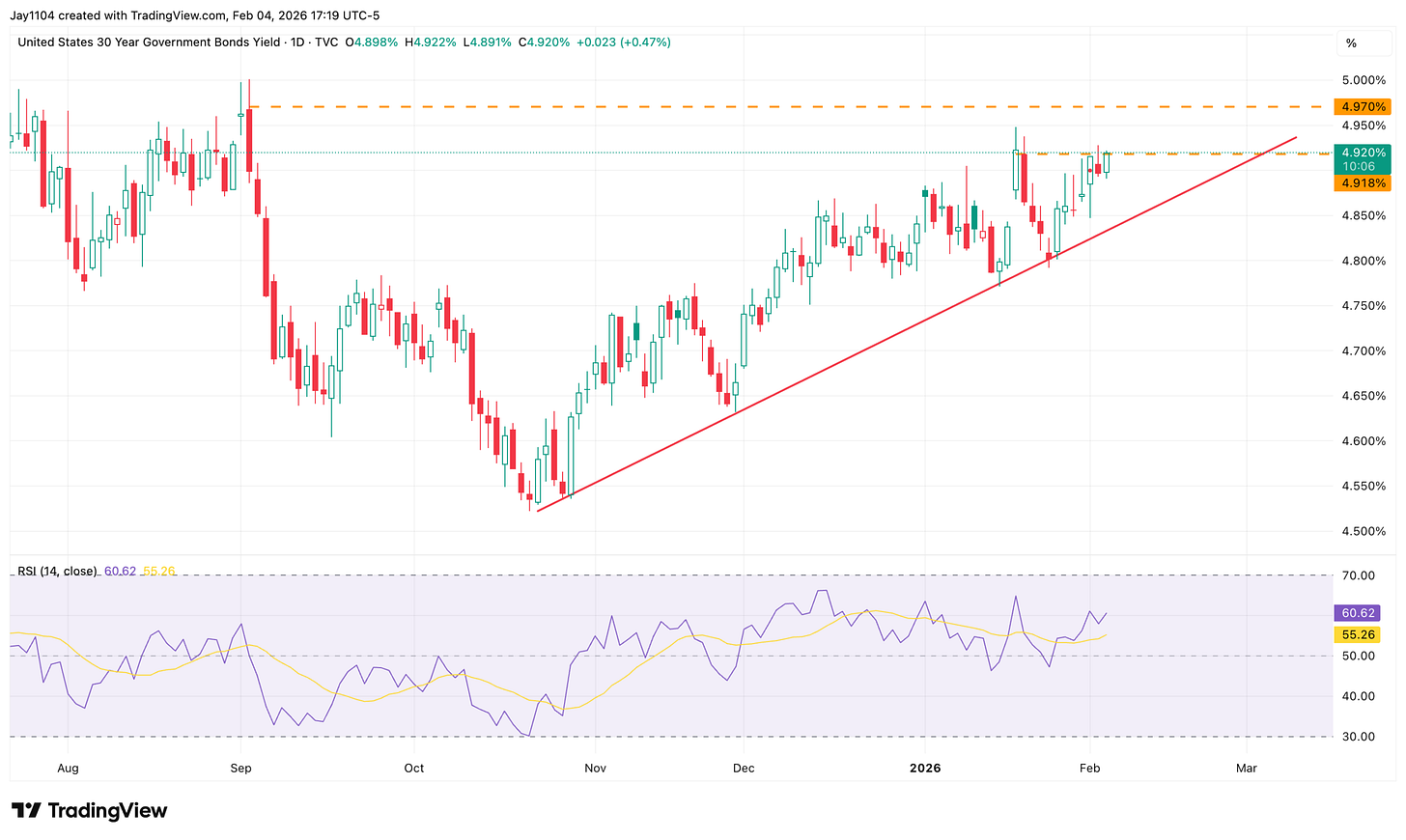 Rates rose today by around 2 bps on the 30-year to 4.92, so here we go again. Testing the upper end of resistance, will it break out? Who knows. Rates have every reason to rise for weeks, yet they don’t; they are frozen in time. The 30-year could easily be over 5% at this point, yet we still wait. The QRA today continues to hint at increasing issues on the long end, but it has not yet occurred.