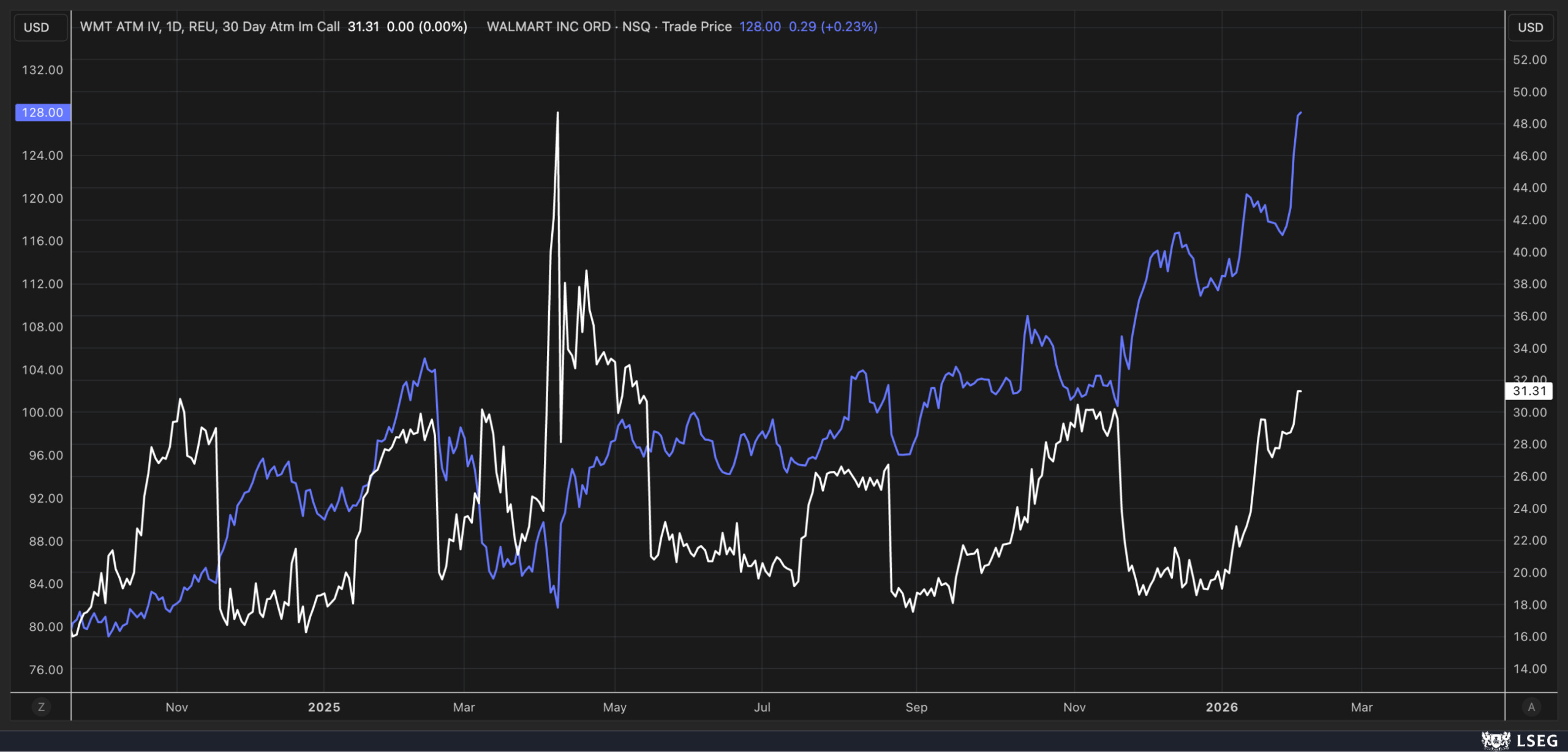 One reason we may be seeing so much strength in Walmart and the “staples” is that implied volatility has been rising, as it normally would heading into earnings season, but this year, IV appears to be heading much higher than in previous quarters. Walmart doesn’t report results until February 19, and most retailers report earnings later in the season, so it is quite possible that the reason we have seen so much strength in the XLP isn’t that or a rotation, but rather the same dispersion trade we saw pre-tech earnings.