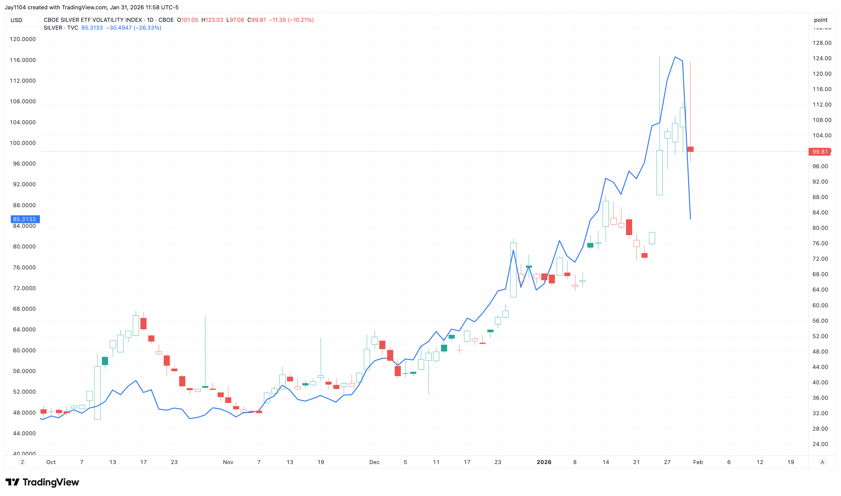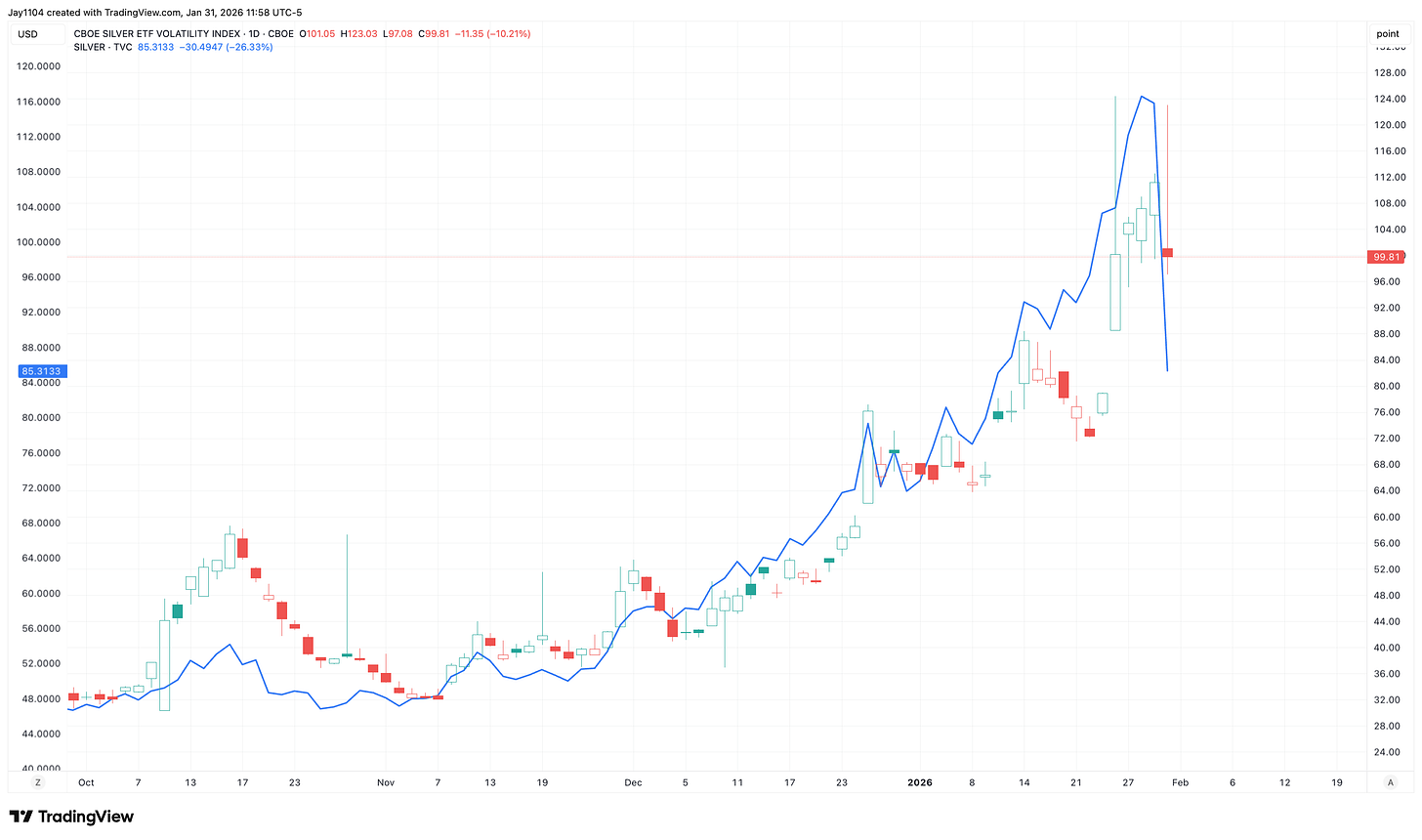 Because many ETFs hold physical silver, reduced demand for options and ETFs can quickly translate into falling metal prices. Leveraged ETFs amplify this effect. When volatility peaks, it often signals a regime shift, which may explain the sharp selloff we’ve just seen.