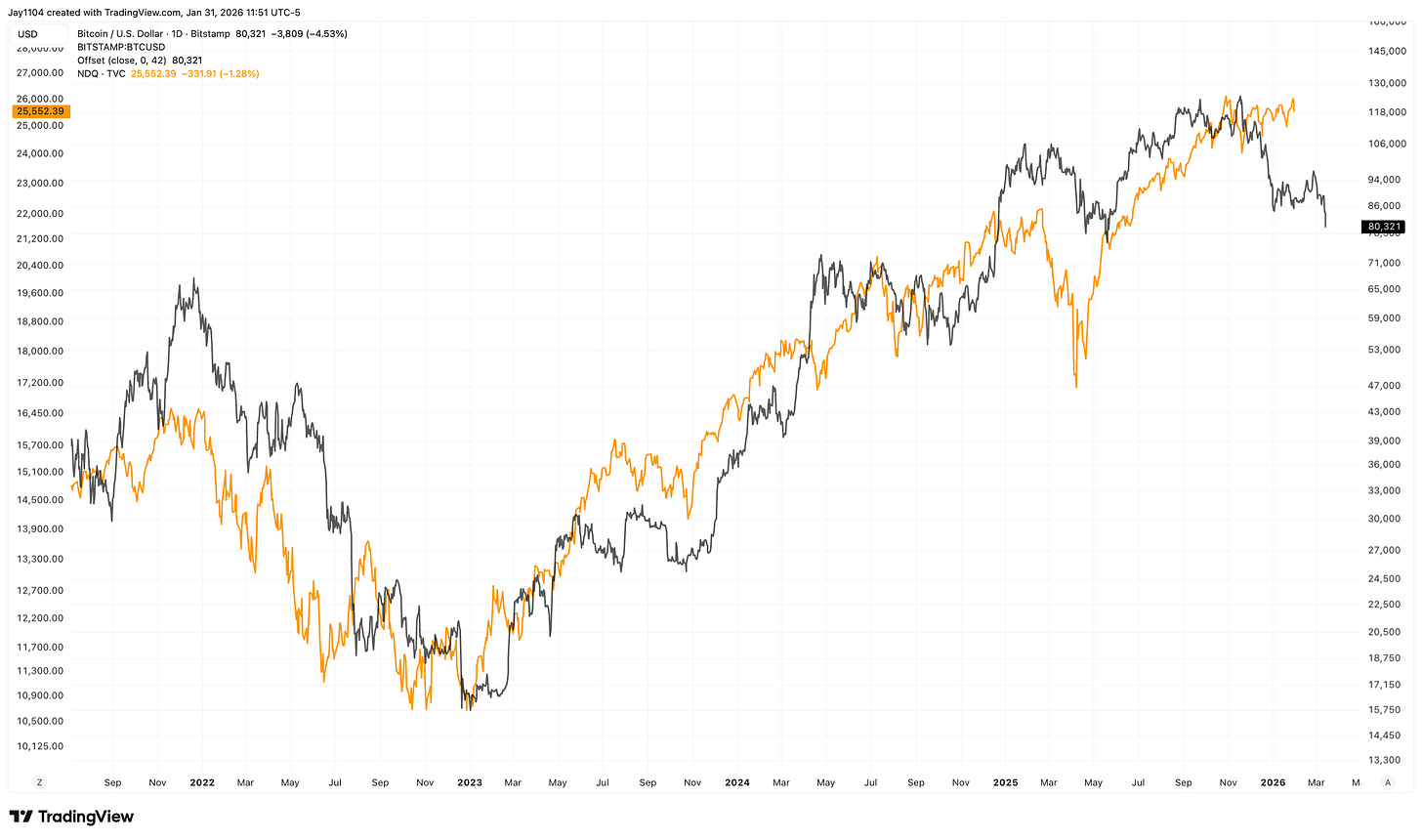 I’m also watching Bitcoin closely because I believe it tends to lead broader equity markets, particularly the Nasdaq, by a few weeks. When reserves fall, Bitcoin usually struggles first, and that weakness often shows up later in equities. If that relationship holds, it suggests that the recent softness in Bitcoin could be an early warning rather than an isolated move.