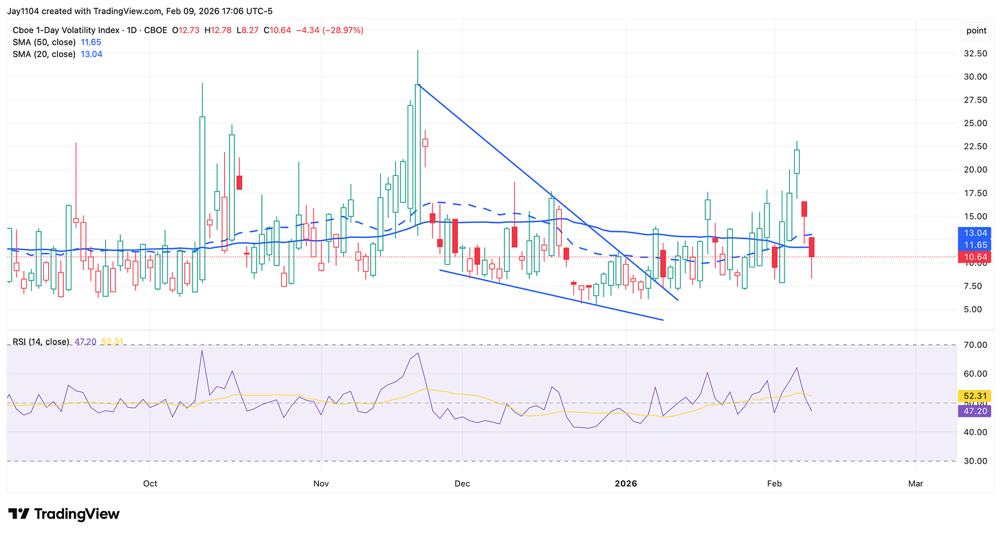Stocks closed higher, with the S&P 500 up around 50 bps. The VIX 1-day completed its reset, dropping to an intraday low of around 8. With the jobs report on Wednesday, I would expect the VIX 1-day to rise and close higher tomorrow.