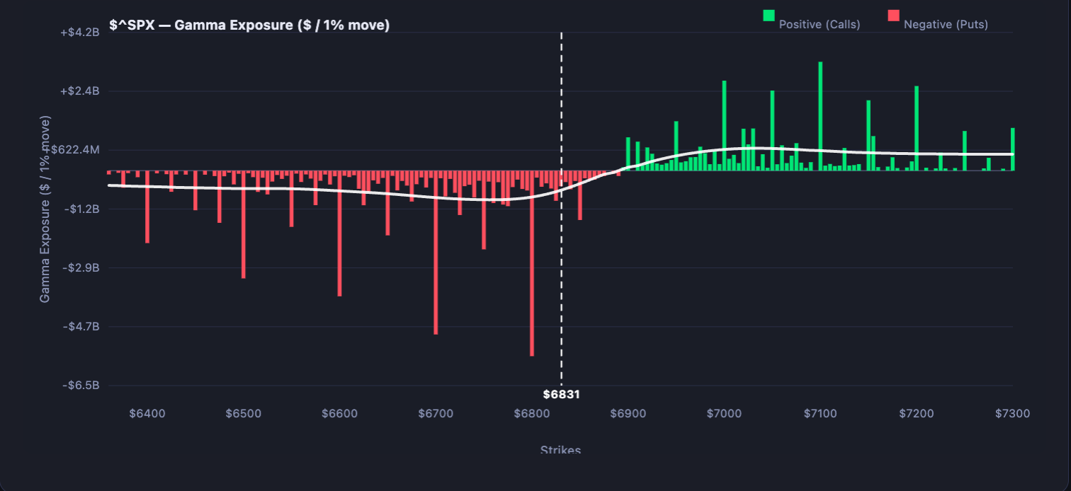 In terms of the S&P 500, the 6,800 level continues to hold and was tested again today. However, there is a large amount of put gamma at that level, making it a very sticky area. Until it erodes, the market will likely continue to see these failed attempts to break lower.