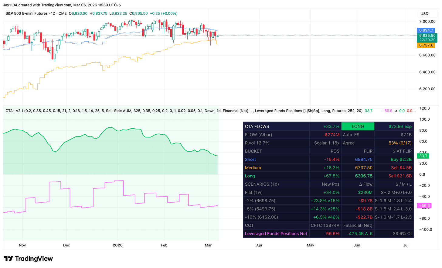 At least based on my own model estimates, the medium-term CTA level appears to be around 6,740. That medium-term flip level has been acting as support beneath futures for the past four trading sessions. This is something new I have been working on and trying to calibrate. If it continues to prove useful, I can share it from time to time.