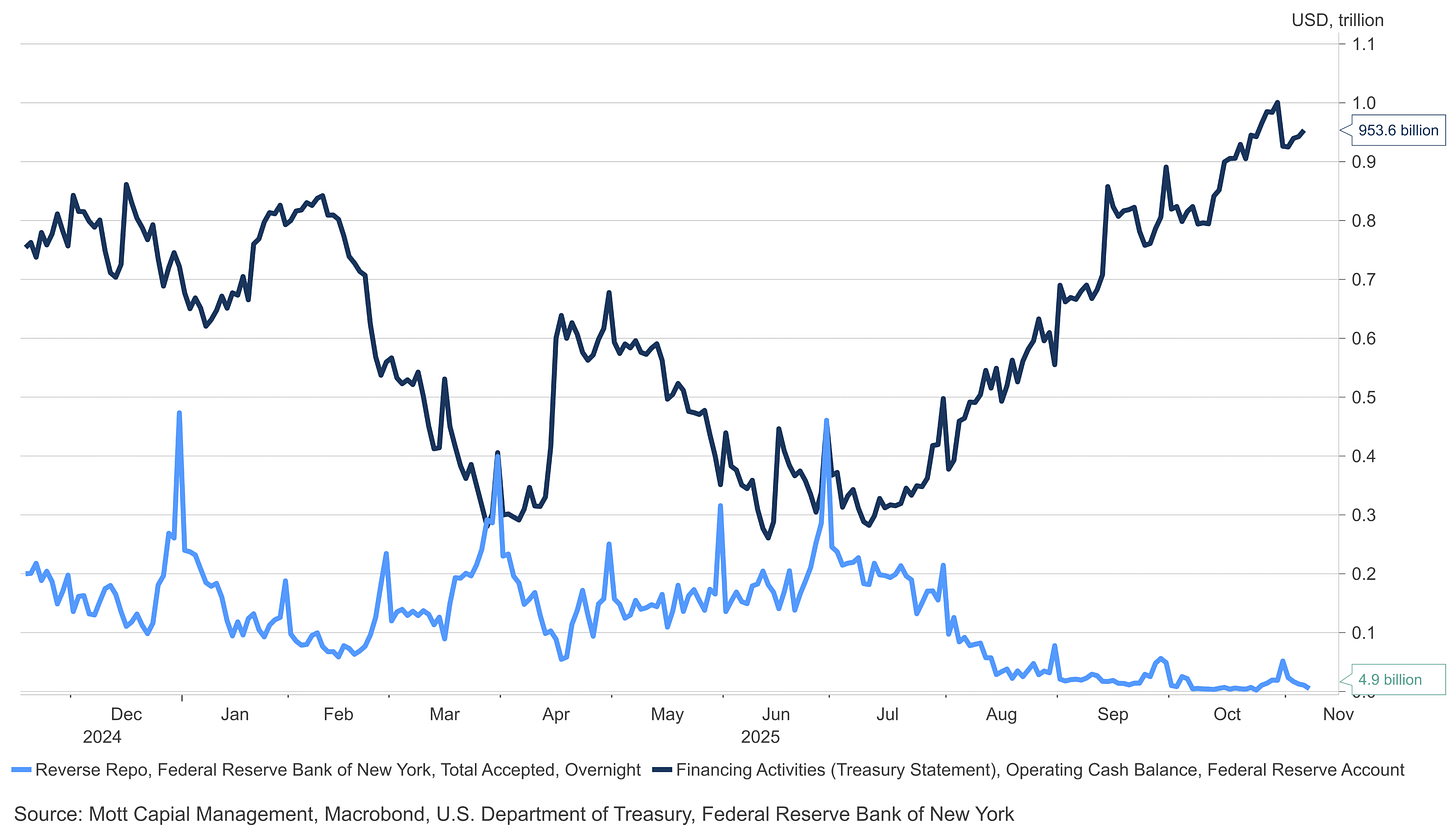 In the meantime, the TGA is targeting a year-end total of around $850 billion, and, as a rule of thumb, the Treasury typically likes to keep at least one week’s worth of liquidity in the account. With the TGA currently at about $950 billion, there’s roughly $100 billion too much sitting in it. This means that when the government reopens, we’ll likely see the TGA fall by about $100-$200 billion. However, if it drops below $850 billion, the Treasury will likely refill it to that level. So, by that measure, there isn’t a massive amount of fiscal QE entering the system. The TGA shouldn’t drop back to the near-zero levels seen during the debt ceiling period—and if it does, it will just be replenished, as per the Treasury’s latest Quarterly Refunding Announcement, last week.
