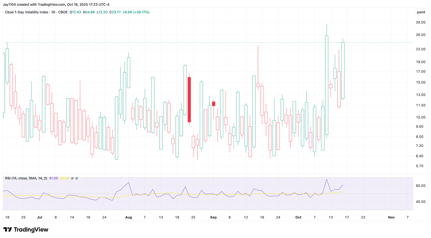 The S&P 500 fell by roughly 60 basis points today, but the volatility complex behaved as if the market had plunged much more sharply. The VIX-1D surged nearly 40% to 23.7 — implying a 1.5% expected move for tomorrow when divided by the rule of 16 — yet that magnitude wasn’t reflected in the index itself