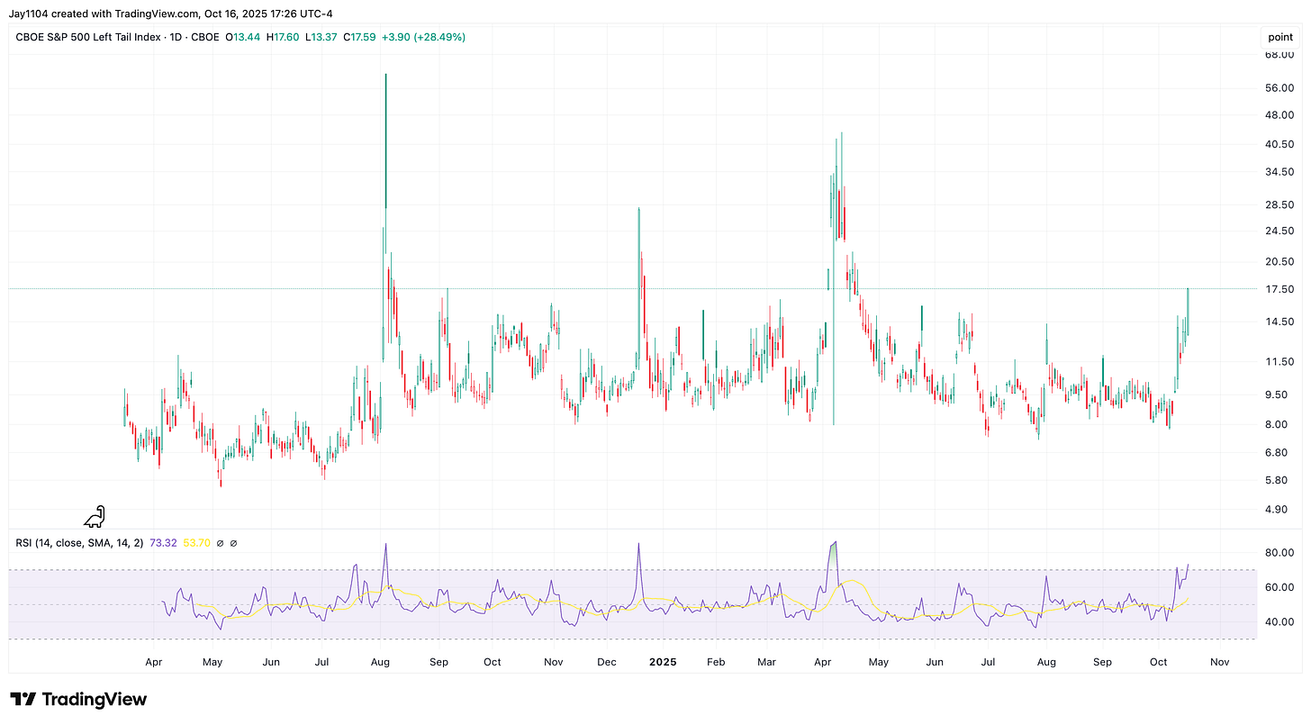 Beneath the surface, volatility measures exploded: the implied correlation index rose 45% on the 1-month to 19 and 25% on the 3-month to 21, while dispersion stayed relatively mild. The Left Tail Index jumped to 17.5, signaling heightened demand for downside protection.