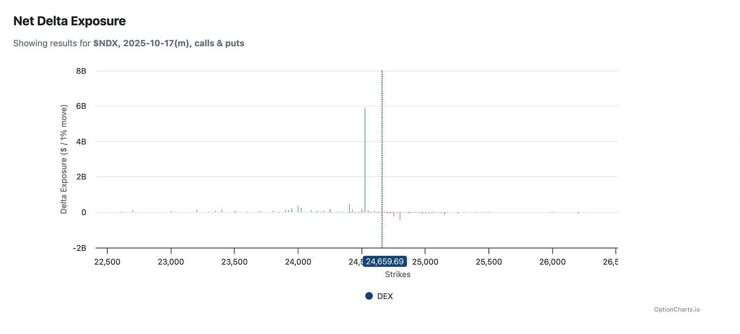 Meanwhile, weakness in the regional banks and private equity continued. My guess is that the QYLD ETF, which we don’t really talk about much anymore, was unwinding its covered call position at the 24,525 strike for October 17, which may have contributed to today’s unusual activity, and may have even caused that nearly $2 billion buy imbalance on the SPX. Tomorrow, they’ll likely write a new call, which should create stock for sale.