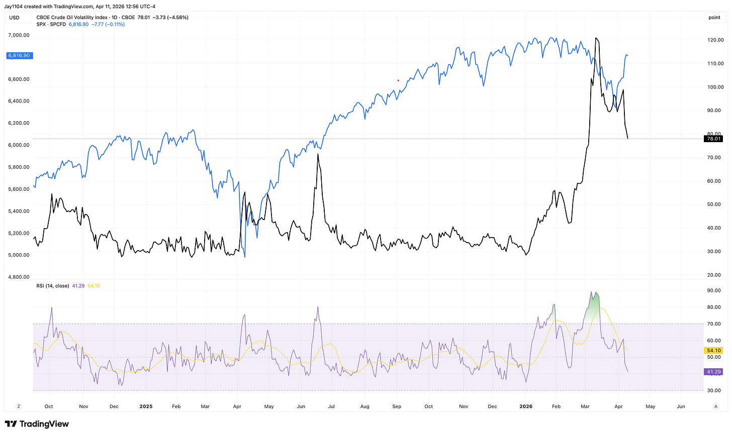 But what clearly stands out is that you are seeing oil implied volatility coming down, which I think is important. Oil implied volatility probably continues to come down because oil is likely going to start finding some sort of natural trading range. This was the kind of volatility that’s created around a repricing of risk and a repricing of markets around a major news event. Now we’re in a position where we’re trying to find a range that we’re settling into. Right now, that range is between $85 and $115, and we may find that it continues to condense into a range closer to $95 to $100. We’ll just have to keep an eye on that.
