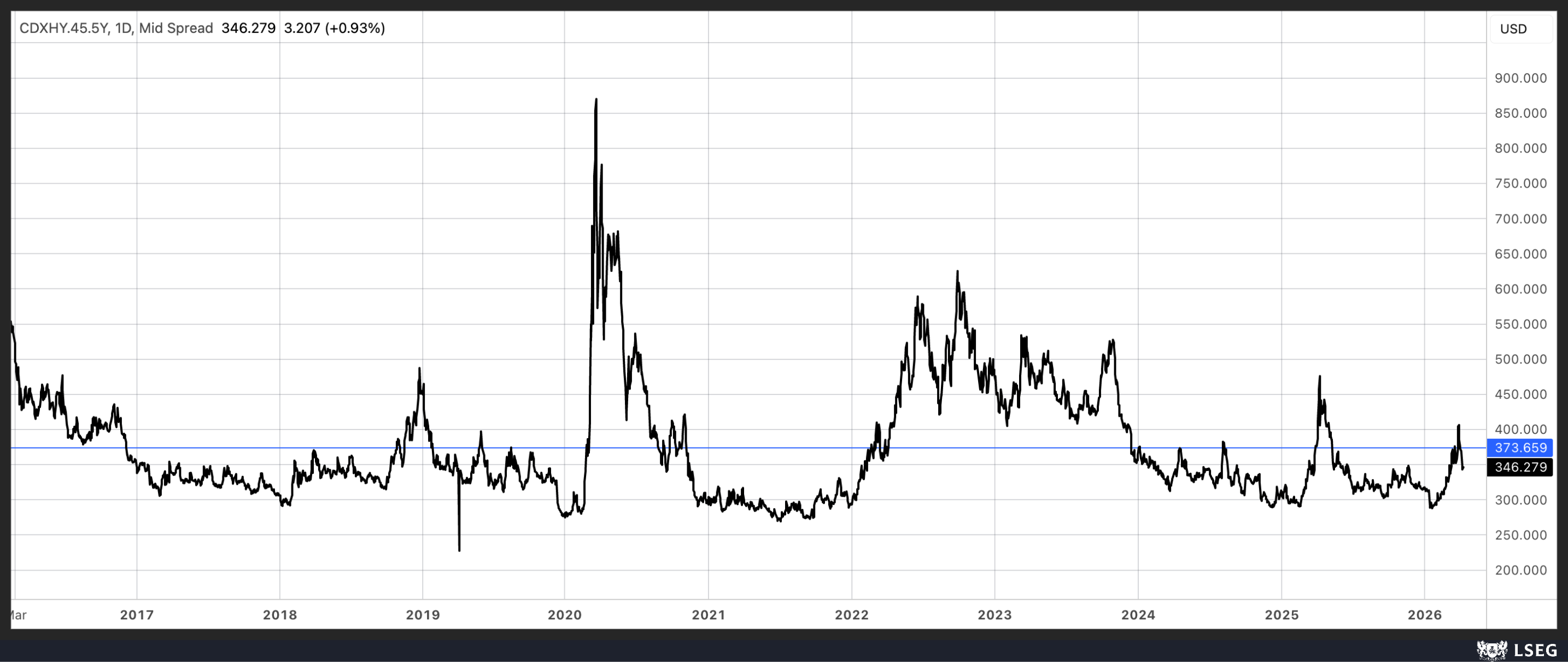 I think this is telling us a lot about what the market’s thinking. The equity market and credit appear to be saying that the worst of all of this is behind us. This is reflected in the fact that you’re seeing high-yield credit spreads really come back down toward 346 on the CDX high-yield credit spread index. That’s an important indication, because the 370 area in the past is a level I’ve highlighted to members as the area where you can see spreads really begin to widen out or stop widening out. In fact, you saw that happen on a couple of occasions in this region.