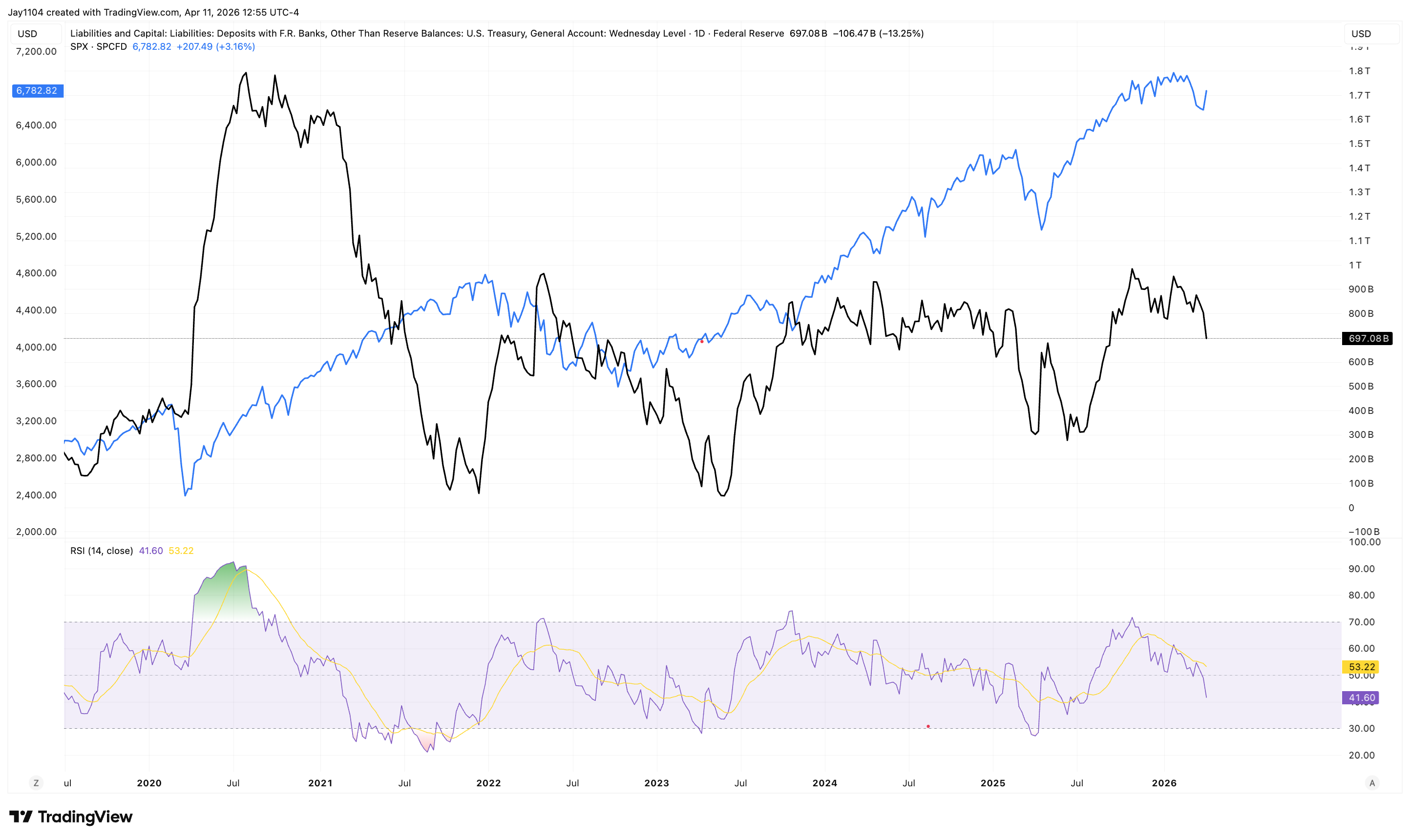 If this seasonal pattern around tax day persists — that we see a big jump in the TGA due to tax season — then it’s likely an indication that you’re going to see liquidity start coming out of the market. For example, in April 2022, the TGA was around $550 billion the week of April 13th, and by the following week (April 20th) it was up to $902 billion — nearly a $350 billion jump. In April 2023, the TGA went from around $88 billion to $265 billion the week after, about a $200 billion jump. That was during one of the many debt-ceiling challenges and government closures. Then in April 2024, the TGA was around $672 billion and jumped to $929 billion — about a $300 billion increase. And in April 2025, we went from around $315 billion all the way up to $630 billion, an increase of about $300 billion.