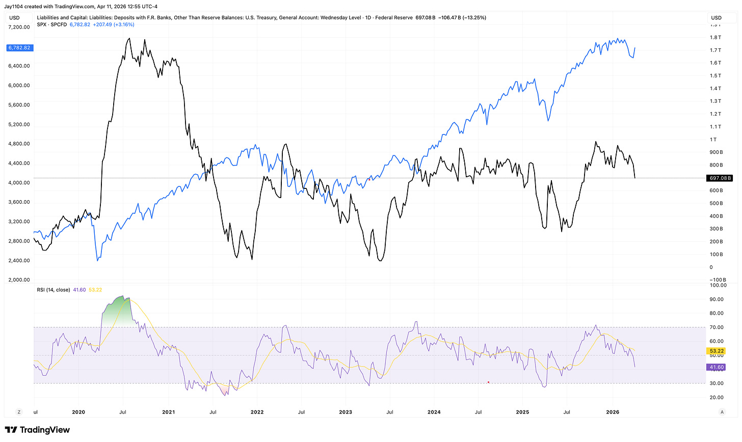 Liquidity Tailwind Set to Reverse Around Tax Day: Fed reserve balances surged to ~$3.2 trillion on a TGA drawdown to $700 billion, but tax-season inflows are poised to push the TGA back toward $1 trillion, draining reserves potentially to the $2.8–2.9 trillion range and tightening financial conditions in the coming week.