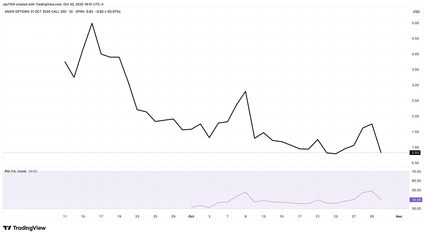 Amazon is trading higher after hours, but the problem is that the call wall sits at $250. The $250 calls expiring tomorrow closed today at $0.83, down from $2.17 on Wednesday. With the stock trading around $251 after hours, those calls still aren’t worth much and will likely be dumped, which could cause the stock to give back a good portion of its after-hours gains.
