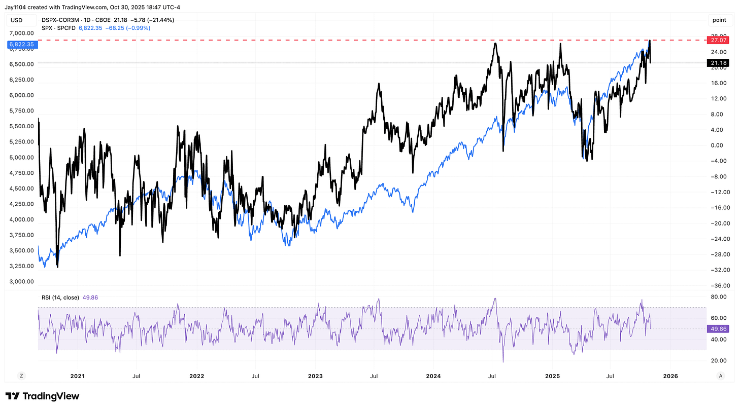 In the meantime, the VIX actually closed lower on the day. But more importantly, the dispersion index fell and implied correlation rose — exactly what we’d expect now that earnings from the major stocks are out. I would expect this trend to continue tomorrow and into next week. As the spread contracts, the S&P 500 typically declines, and that’s what I anticipate happening going forward.