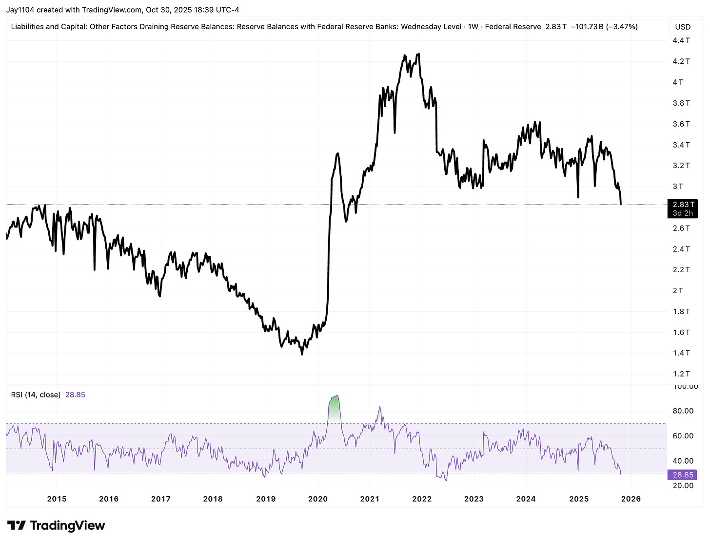 Speaking of liquidity, the reserve balance fell again this week, ending at $2.83 trillion as the TGA continues to climb, draining reserves from the system. Tomorrow marks both the month-end and a $58 billion Treasury settlement date, and I would expect overnight funding pressures to be fairly tight, with increased usage of the Standing Repo Facility.