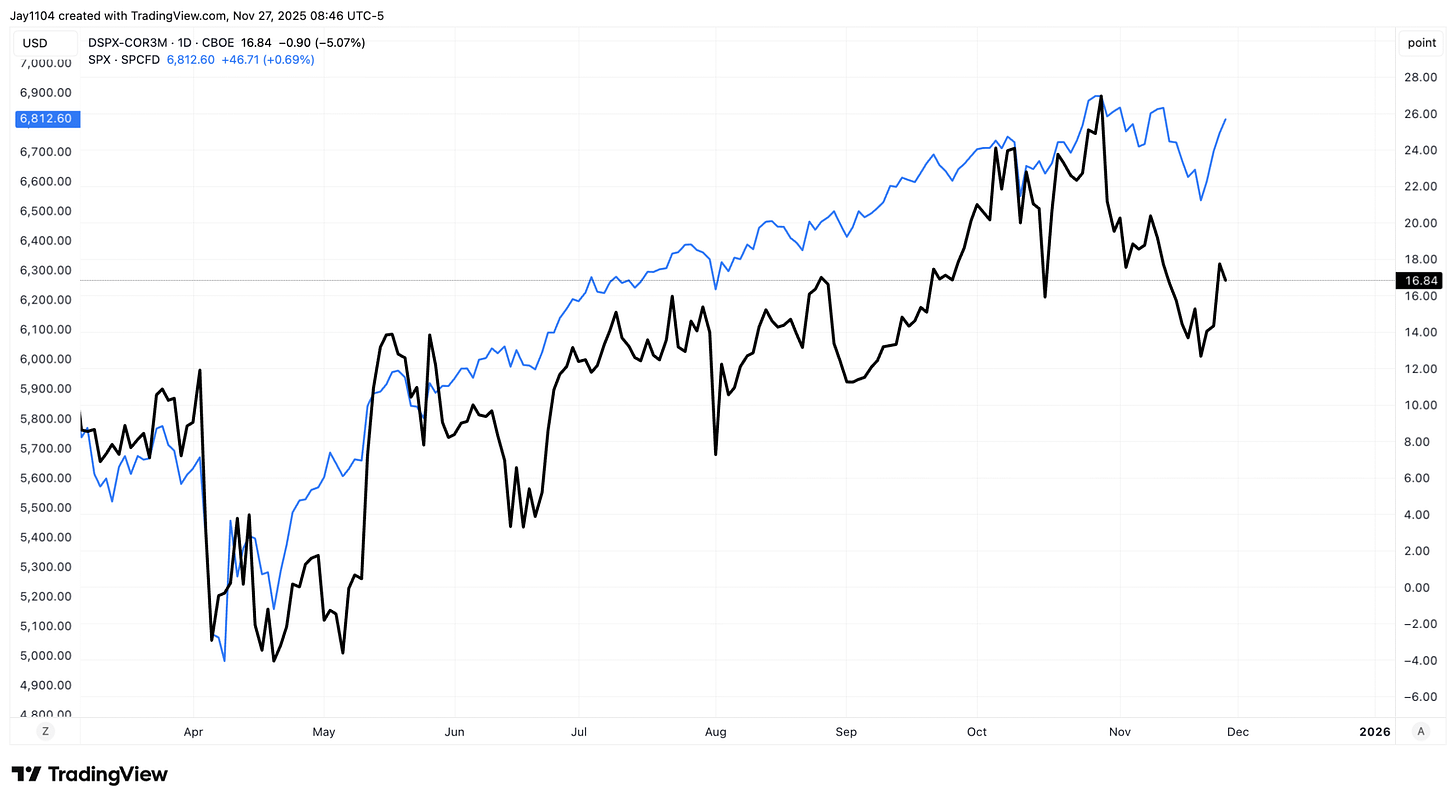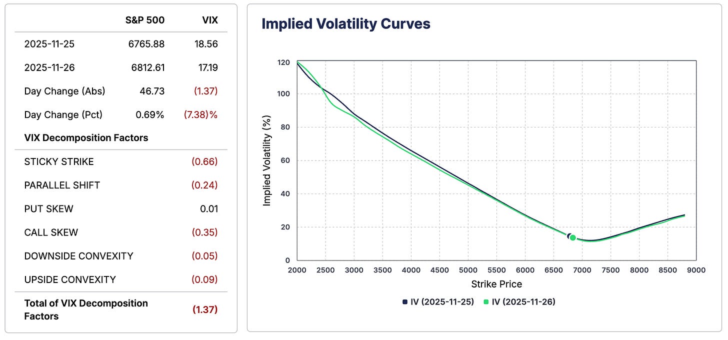 This matters because the rally wasn’t driven by traders buying equities; it was driven by traders selling volatility. The aggressive marking-down of downside vol mechanically lifted the index, rather than genuine demand for stocks.