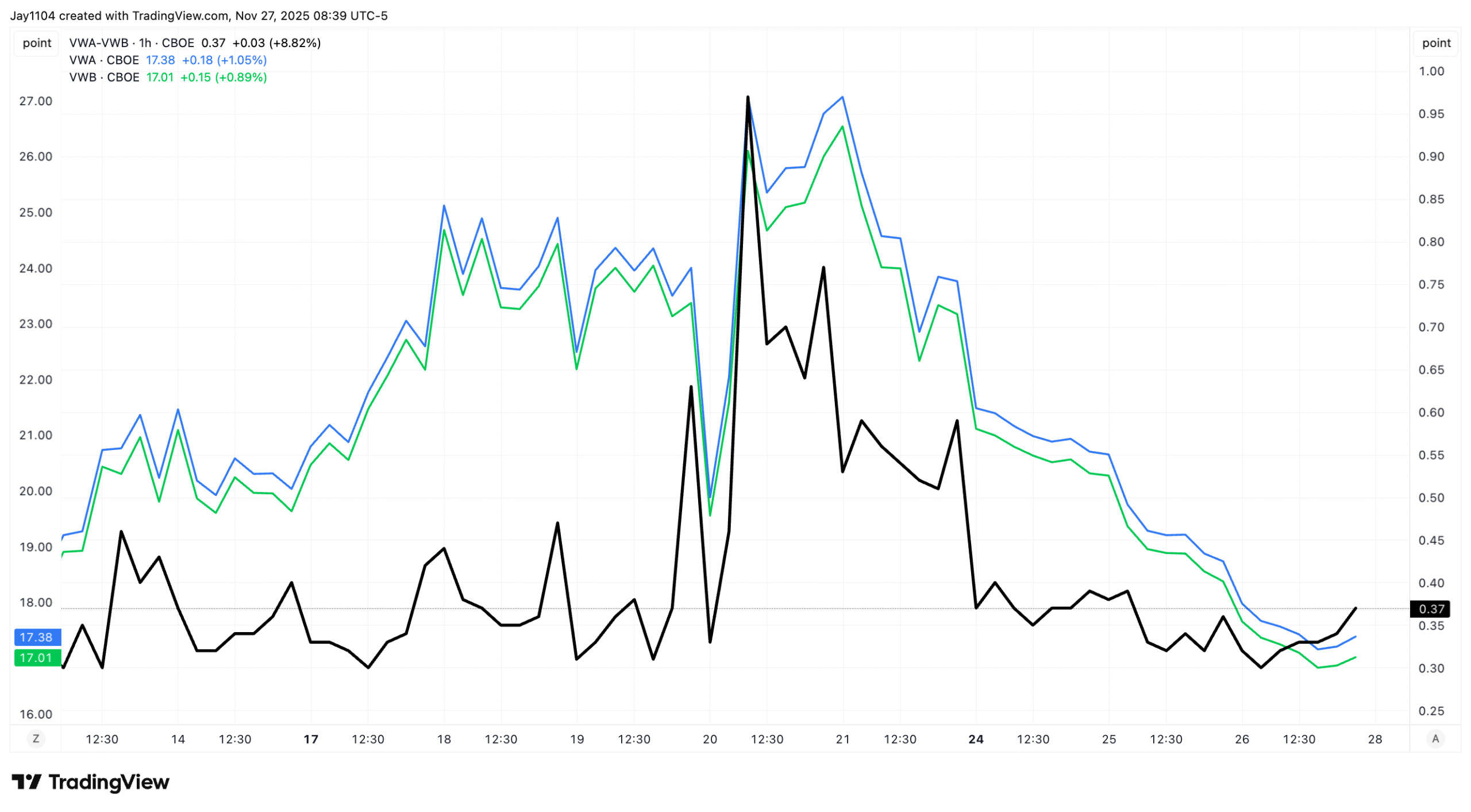 Stocks rallied again on Wednesday, November 26th, with the S&P 500 rising about 70 basis points. The index fell sharply in the final 20 minutes of trading, giving back nearly a third of its gains. More importantly, most of the activity in the market appeared to be driven by volatility supply, with the VIX falling to 17. Interestingly, the VIX 1-Day closed higher at 14.7, leaving us with front-end volatility rising while volatility further out on the curve was falling.