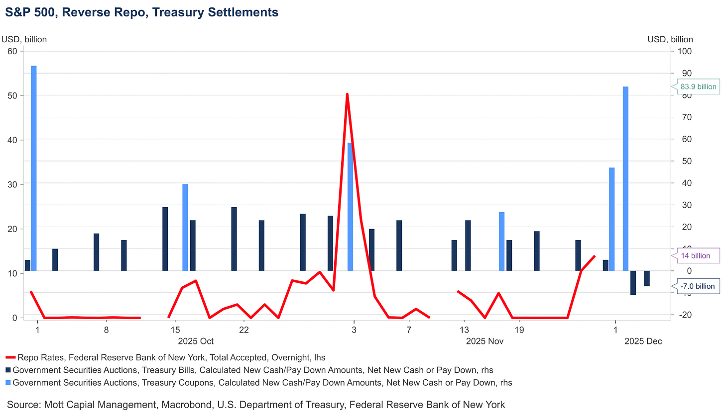 This matters a great deal because the two largest settlement dates of the week are still ahead of us. The biggest will occur on the 28th, when roughly $52 billion of Treasury bills and coupons are set to settle. Then, on December 1st, another $84 billion in coupons will settle. This will be followed by a net paydown of about $11 billion on December 2nd and another $7 billion on December 4th. Even with those paydowns, a substantial amount of liquidity will be drained on Friday and Monday. Combined with the month-end, these flows should tighten overnight funding rates and overall liquidity conditions as both dynamics play out simultaneously.