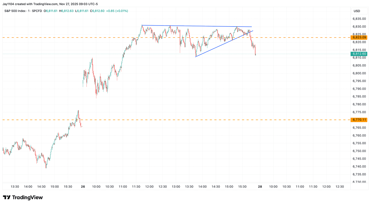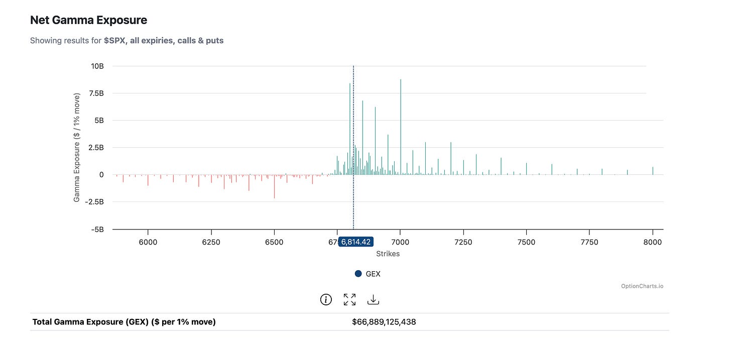 Coupled with a strongly positive gamma setup in the S&P 500, and major gamma resistance zones around 6,850 and 6,900 — we are in an environment where market makers will naturally act as sellers of rallies and buyers of dips. The problem is that if the index slips below 6,800, there is very little support until roughly 6,500, and the gamma-flip zone sits somewhere between 6,750 and 6,800. This means we are very close to flipping back into negative gamma territory should the market begin to weaken at all on Friday or Monday, at a time when liquidity will already be extremely thin. In that scenario, with virtually no support in the marketplace until much lower levels, it is quite possible that a meaningful portion of the past few days’ rally could be retraced quickly if mechanical flows reverse and take control of price action.