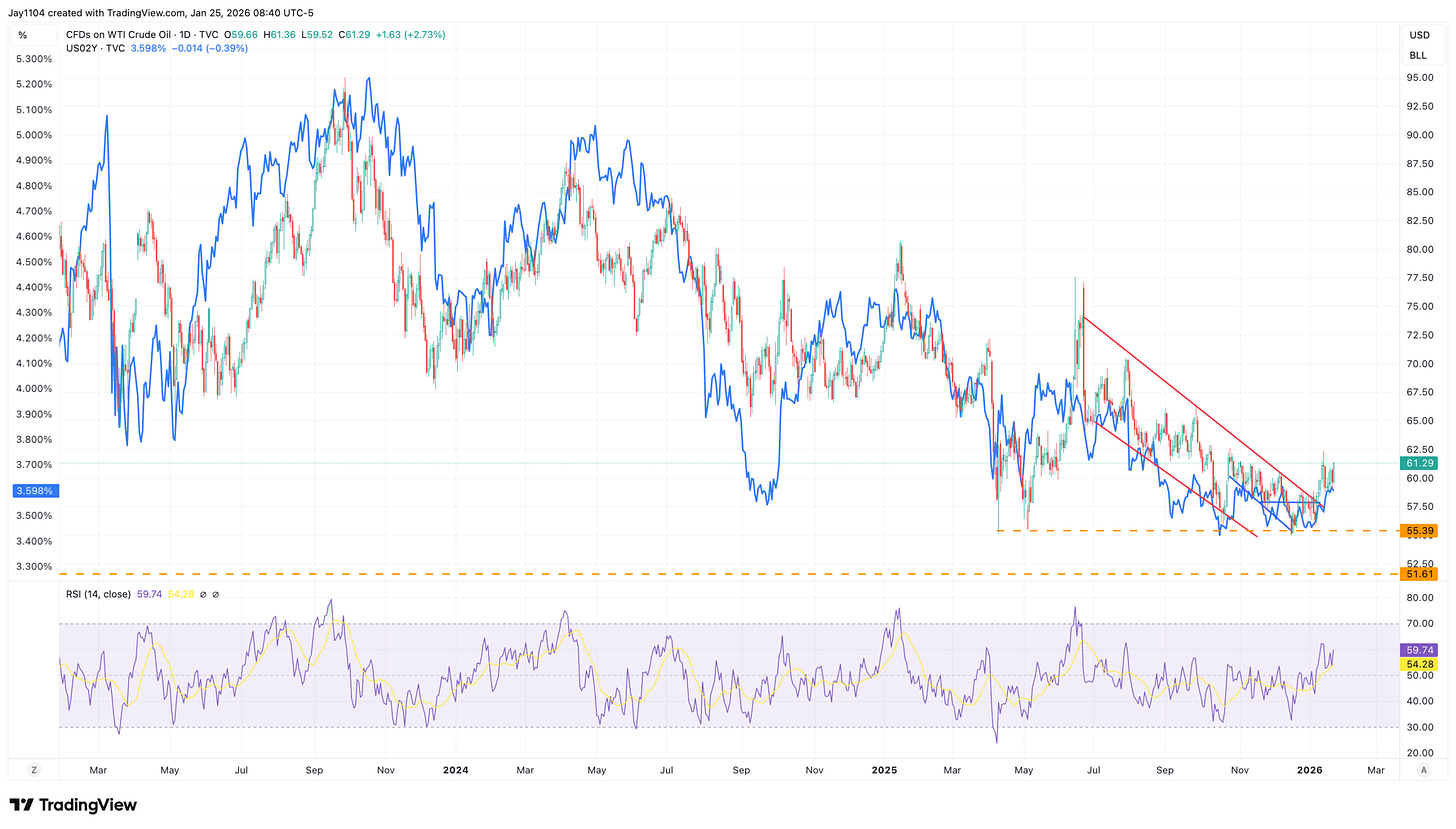 Where the 2-year goes, though, may be tied more to oil. With inflation still running around 3% and oil dropping to around $60 from a high in the $120s, this really emphasises the idea that higher oil prices could easily start driving inflation higher again. Which is probably why the chart of oil and the 2-year look nearly the same.