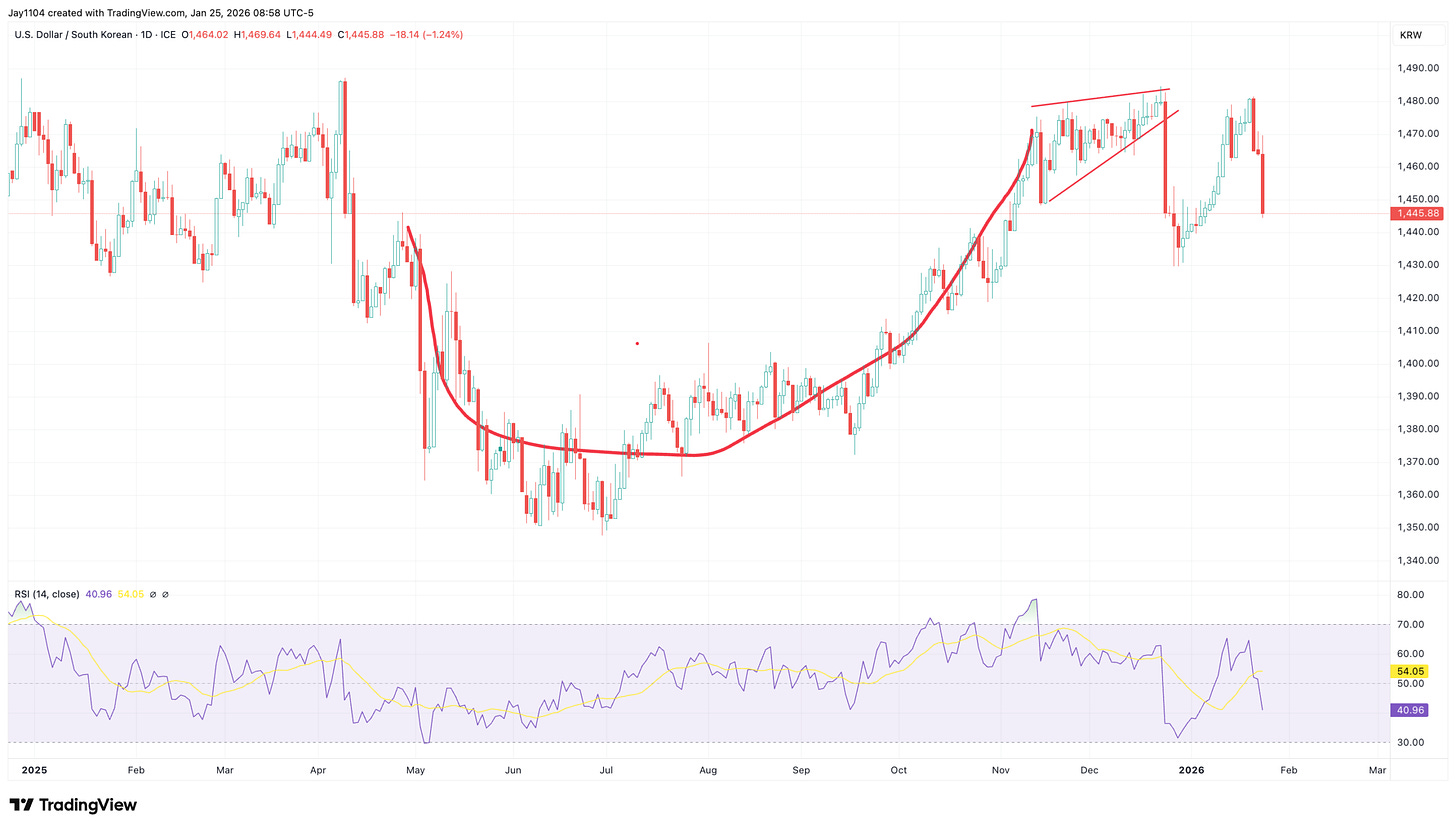 The KRW probably matters more than most would think, given that South Korean investors have built up a sizeable stake in US equities. It is probably one reason why the KRW has weakened so much. An investor in SK has to sell KRW to buy USD to buy US equities. So, if the KRW starts to strengthen at this point, it could begin to pressure this trade, because the FX exposure leaves unhedged investors exposed to potential USD losses.
