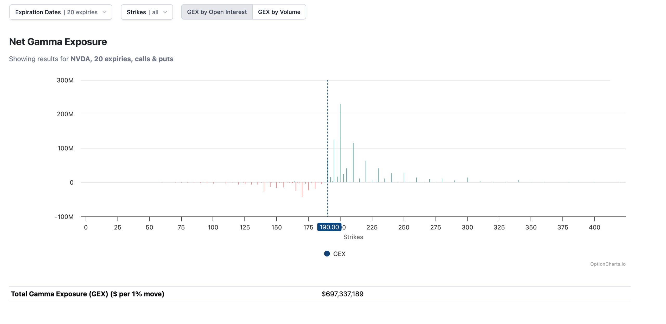 There is significant call gamma concentrated around the $195 to $200 area. We do not know precisely how that exposure is distributed between customers and dealers, but the clustering itself matters. Large open interest in that zone can act as a resistance band, making it harder for the stock to sustain a move through that range without a true upside surprise.