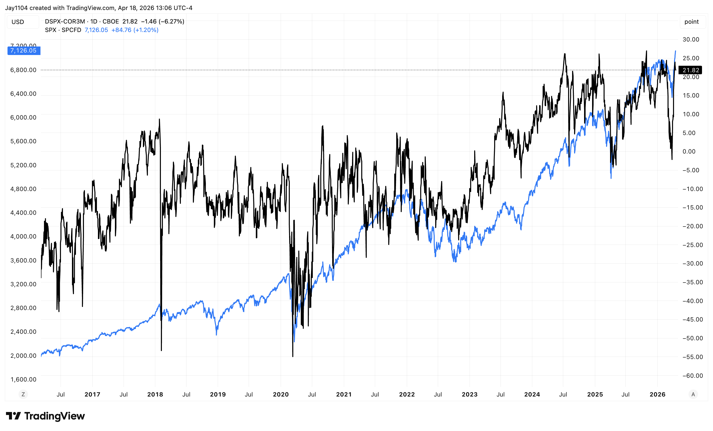 DSPX Minus 3-Month Correlation Spread at Historic Wides: The spread between the dispersion index and 3-month implied correlation has widened from 13.6 at the start of April to 22 today — near record highs historically and a classic sign of the seasonal dispersion trade into earnings.