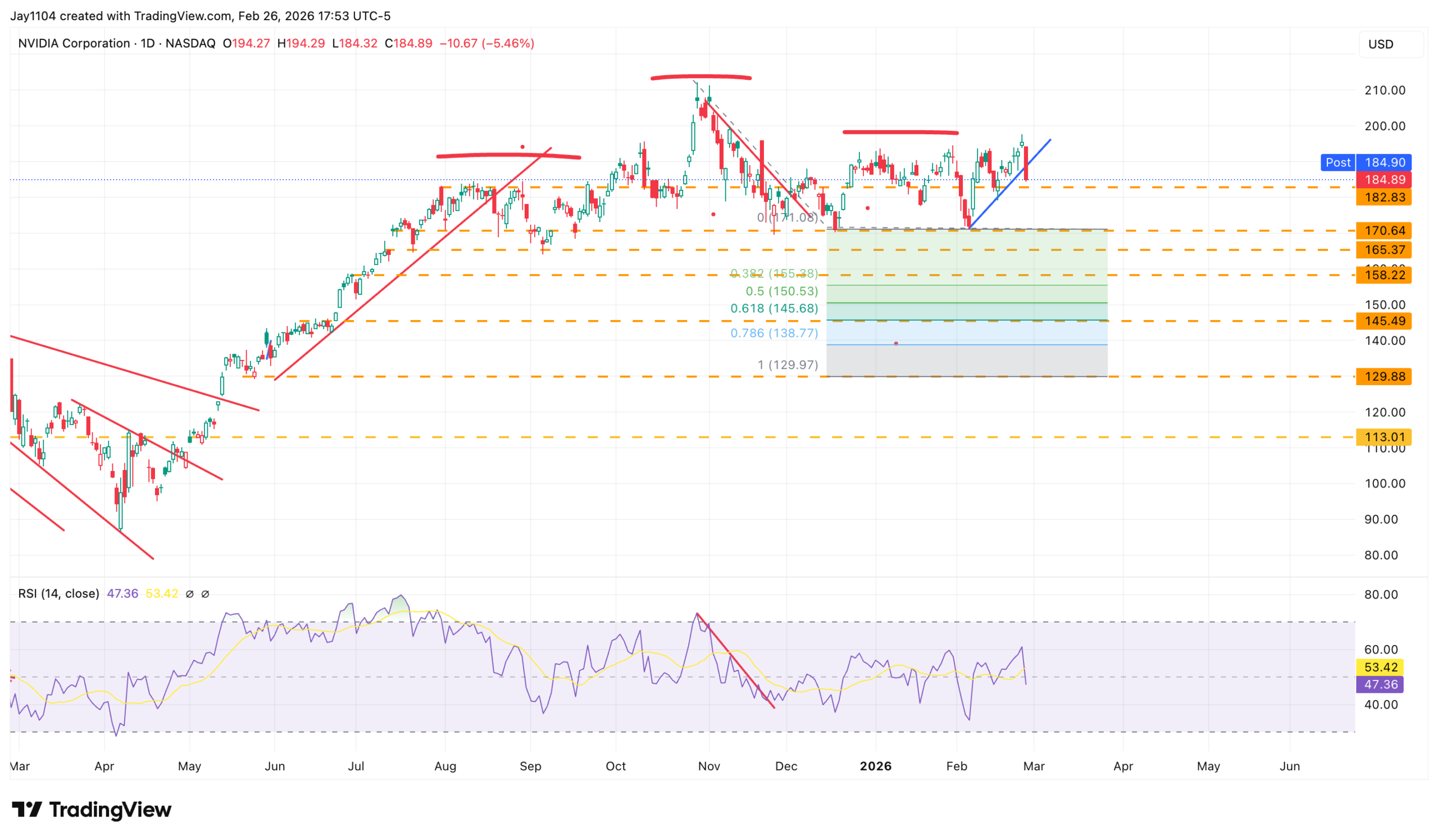 As for Nvidia, there were no surprises in today’s sell-off. It was widely noted that a move lower was the likely outcome, given the options positions heading into results and the high levels of implied volatility. The key level at this point is $170, and it could come into play over the next few days to a week. If that level breaks, it will become a big problem for the stock and the market. It would confirm what appears to be the neckline of a head and shoulders pattern, with a projected decline to around $130.