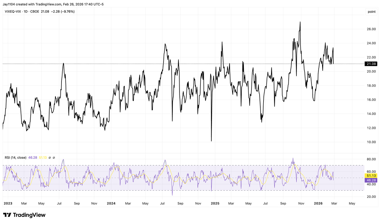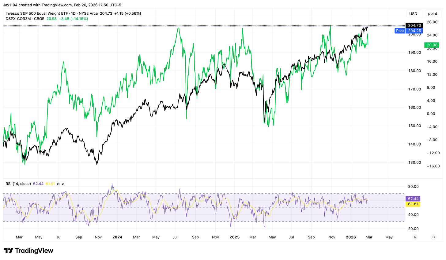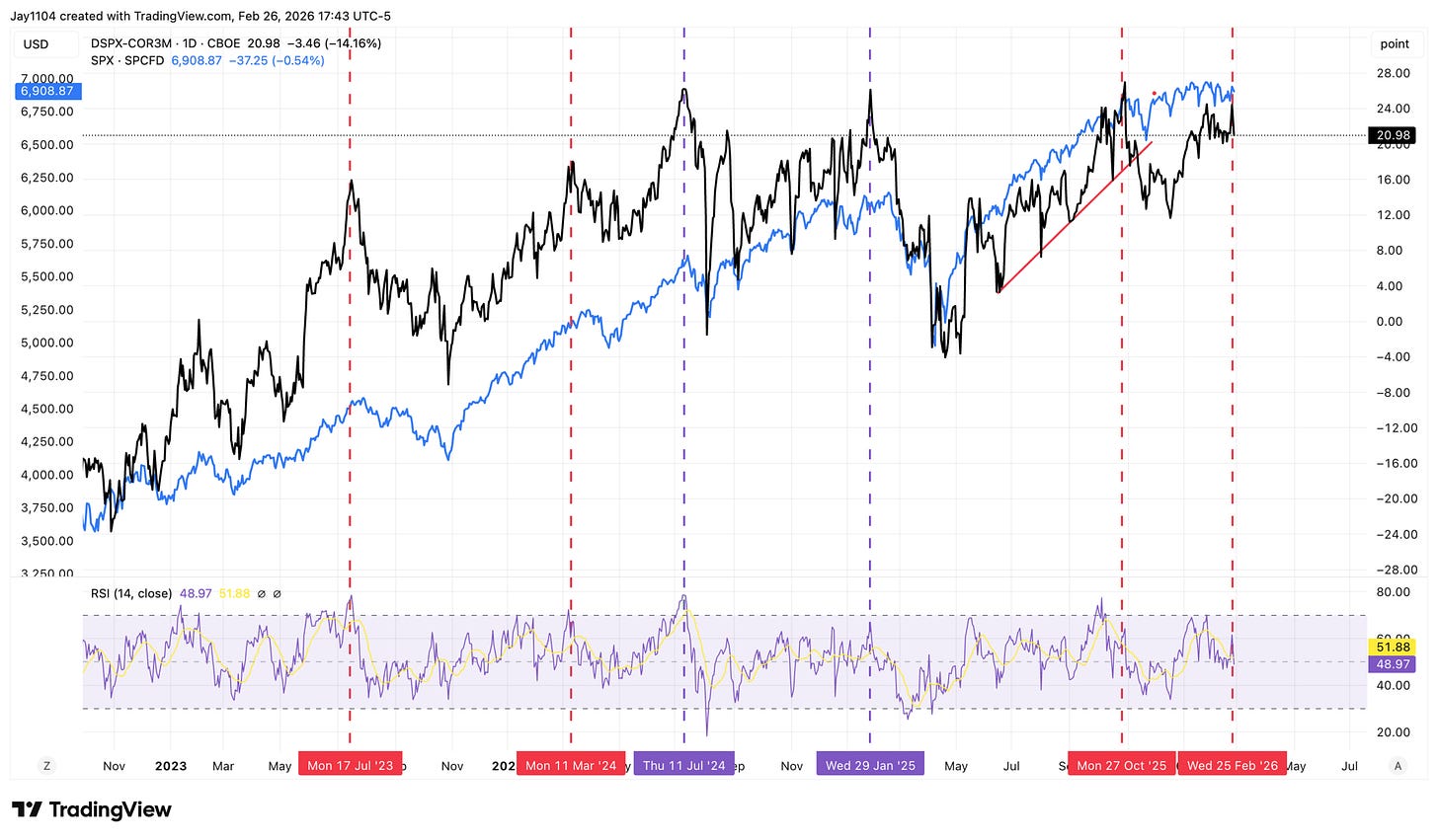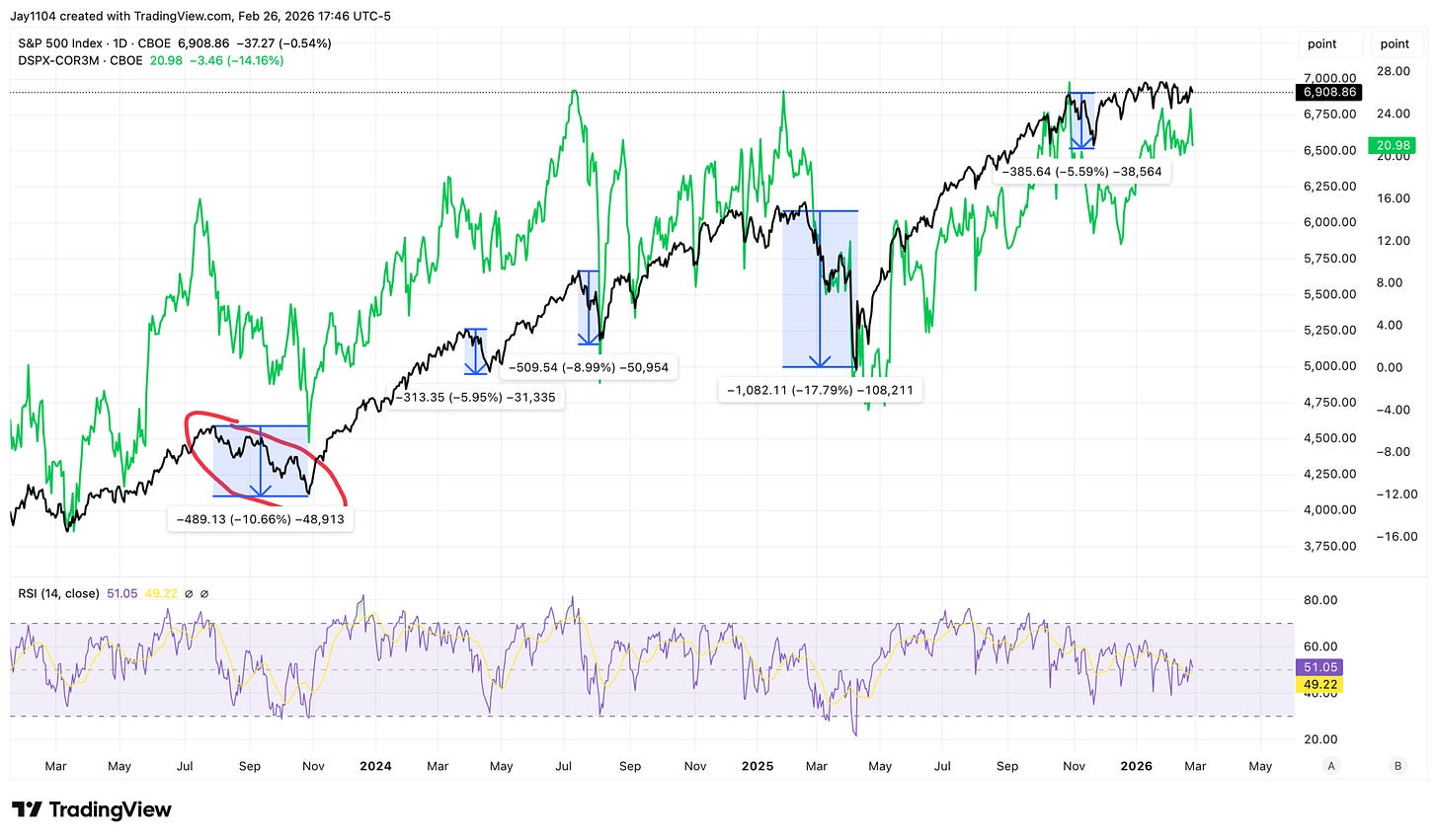 Over the last few occasions when the spread was this wide, we have seen declines of 5% to as much as 17% based on closing prices, but a 5 to 10% pullback seems possible at this point. Nothing is clean and easy to decipher in the market, but the unwind in November 2025 was a bit unusual, so, in theory, the decline could have been bigger, though other year-end factors may have been in play.