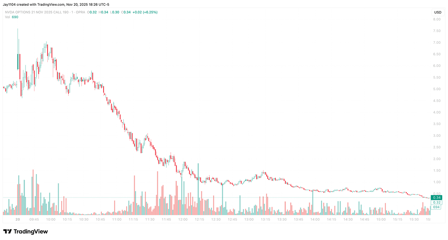 When you factor that in—along with all the higher-strike calls that were already deeply underwater—it felt like only a matter of time before the $190-and-above crowd began unwinding. Once NVIDIA started to roll over, that unwinding triggered a snowball effect. The $190 calls, which closed today at $0.34, were around $5.50 yesterday and, even during the strongest part of today’s session, were only worth about $7 for the first 30 minutes. As soon as those calls fell below $5 around 10:49 a.m., volume surged, and that was essentially the breaking point.