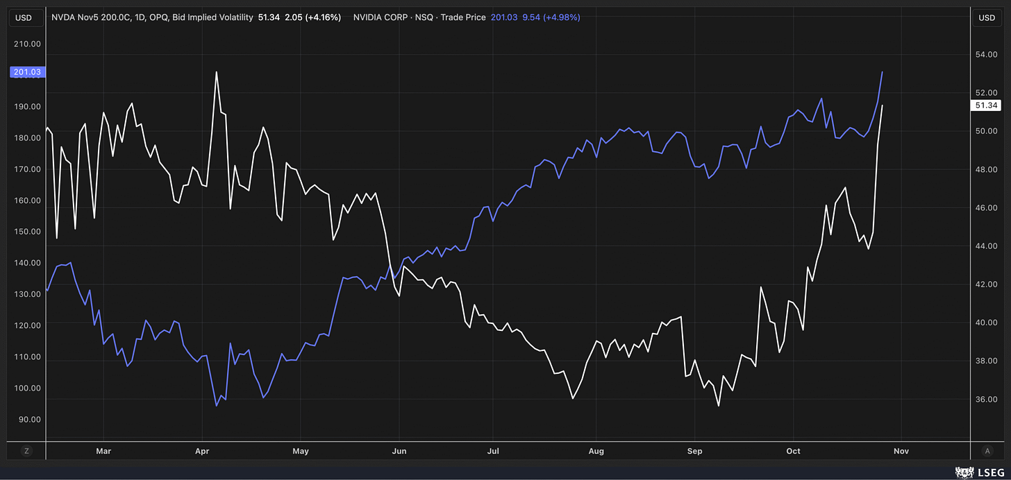 Speaking of rising implied volatility, today’s nearly 5% surge in NVIDIA came with a sharp spike in implied volatility on the options — a move typically associated with gamma squeezes and driven more by options trading than by any fundamental developments. While today’s headlines likely pointed to company-related news serving as a trigger, it’s clear that the move, both today and over the past few days, has been fueled primarily by call buying and speculative activity.