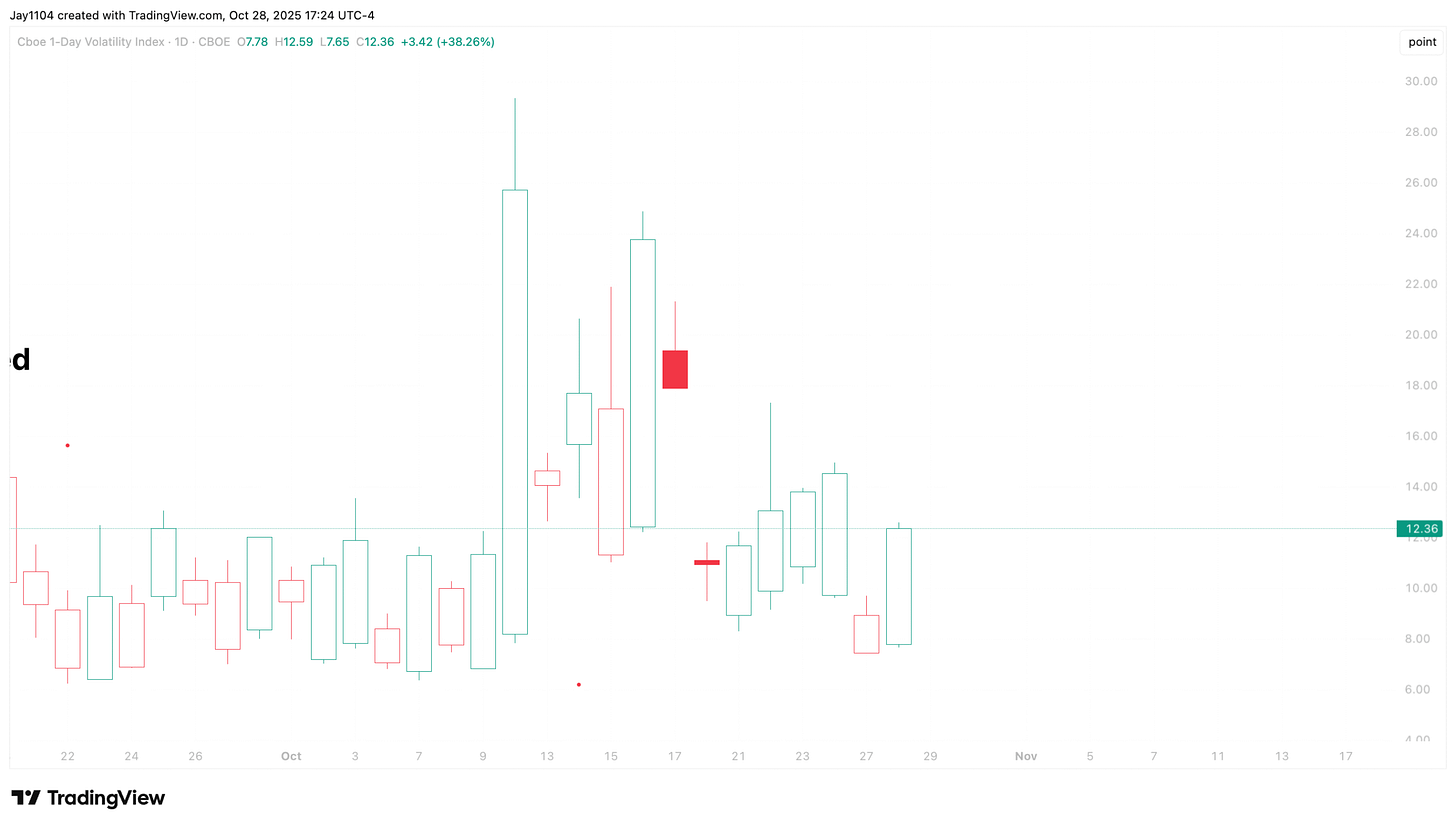 One should also keep an eye on the VIX 1-Day tomorrow. Given that it’s a Fed meeting, it’s likely to rise. Typically, when the VIX 1-Day increases ahead of a Fed meeting, it tends to fall during or shortly after the meeting. That means there’s a good chance that tomorrow—likely once the press conference begins—we’ll see an implied volatility crush, which could lift the S&P 500 higher regardless of the Fed’s decisions or announcements, as long as implied volatility rises enough beforehand. We’ve seen several examples of this recently, as noted in yesterday’s write-up, with multiple implied volatility crushes occurring on Monday mornings. This same dynamic could potentially play out again tomorrow.
