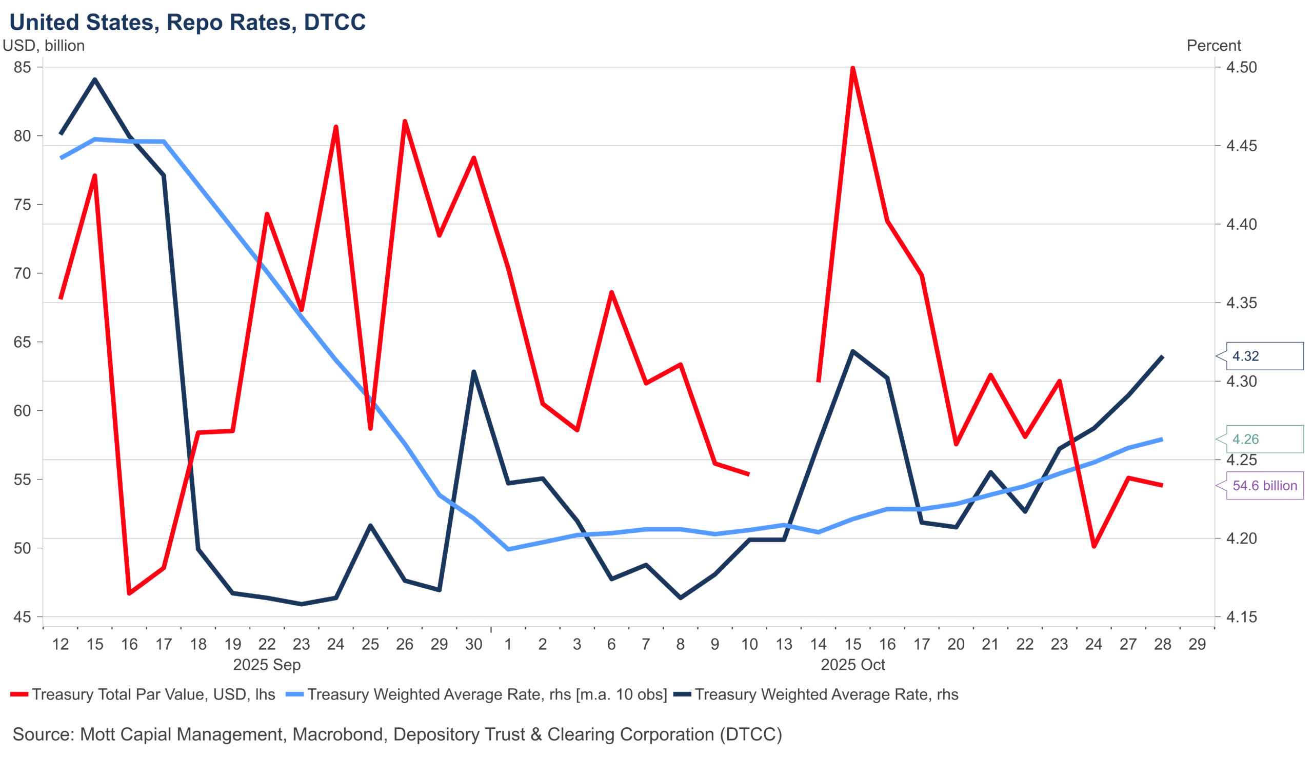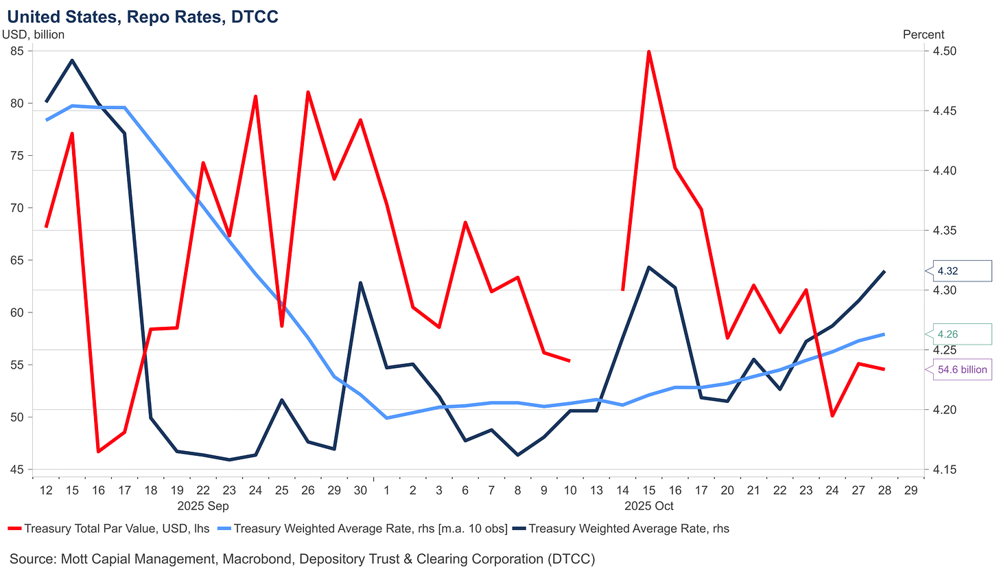 Tomorrow, of course, we’ll have the FOMC meeting at 2 p.m., where we’ll learn whether the Fed decides to halt quantitative tightening. Excessive pressures have continued to build in the overnight funding market, with funding rates moving higher today — the average repo rate at DTCC rose to 4.32%, returning to levels last seen in the middle of the month. It probably means that SOFR will rise again when the NY Fed releases the data at 8 AM. The Fed is also widely expected to cut rates tomorrow.